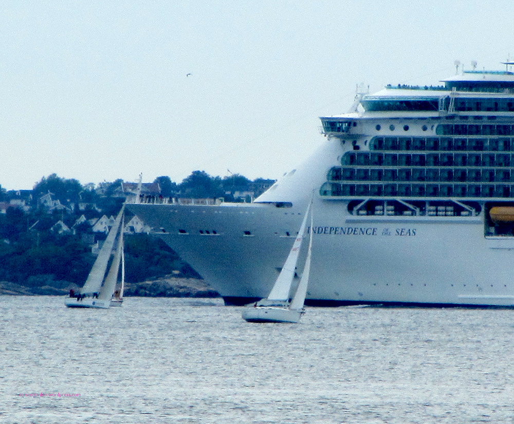 Riktignok ble Independence of the Seas diskvalifisert i gårsdagens onsdagsseilas i Kristiansand på grunn av motorhjelp, men han tok det med stoisk ro. Lot seg ikke affisere med seilbåtene som klunket i baugen. Han forlot byfjorden så 40 foterne skvatt rundt skjærrane. Et majestetisk syn. Og de av passasjerene som muligens ikke lot seg fascinere av lokal seilsport kunne for eksempel slå i hjel tiden i klatreveggen, surfebølgen eller badelandet om bord. Eventuelt i handle-gaten som er sånn ca på størrelse med Markens.