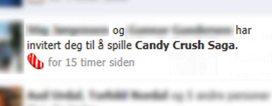 Men da to venner inviterte meg til Candy Crush i et av mine svake øyeblikk, tenkte jeg, – Hmm. Dette må jeg finne ut av. Jeg glemte å spørre meg selv hvorfor. Tabbe!Etter en times testing så jeg fort avhengighetspotensialet og rekkevidden av mitt feiltrinn. Venner og venner og venner popper opp i spillet, med bilder og navn, og jeg inviteres hele tiden til å dele mine resultater, penger, liv, baller med dem. Jeg delte ingenting. Jeg sluttet og meldte meg ut igjen. Jeg ville ikke bli CandyCrushJunkie. Da kom den hyggelige beskjeden fra facebook at de ville bevare litt informasjon om meg for alle tilfellers skyld. FUCK og FAEN. Jeg gikk på en smell. Så nå får jeg CandyCrush meldinger i hytt og pine fra venner som smugspiller. GUDD. Kjære venner. Gjør noe annet.
