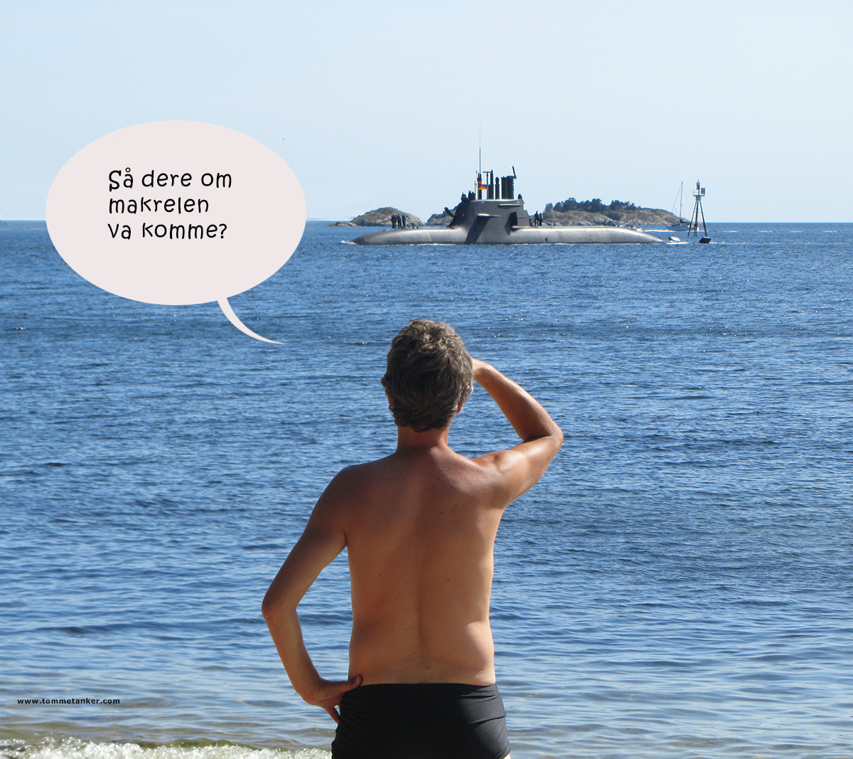 En smeigedag ble innhalert i Bertesbukta. Maneider, veldreider og unger koste seg i vannet. Og fra havgabet snek det seg en lumsk tysk mørk skygge innover fjorden. Lik en haifinne gled den stille innover mot oss. U35 fra Kiel brøytet seg forsiktig gjennom krusningene. Alle så den og kikket nysgjerrig, men rolig. Bortsett fra en mannsperson i sanden nedenfor oss. Litt overivrig, etter min mening, spratt han opp fra sin sandgrop så lopper og lus og sandkrabber skvatt og gjorde honnør til farkosten der ute. En gang gast, alltid gast. Jeg har selv tjenestegjort på U-båt og syntes det var stas og mimreverdig å se Ubåten. Men i likhet med mannen foran meg tok jeg det med stoisk ro. Jeg er da sørlending og vet når makrelen kommer.