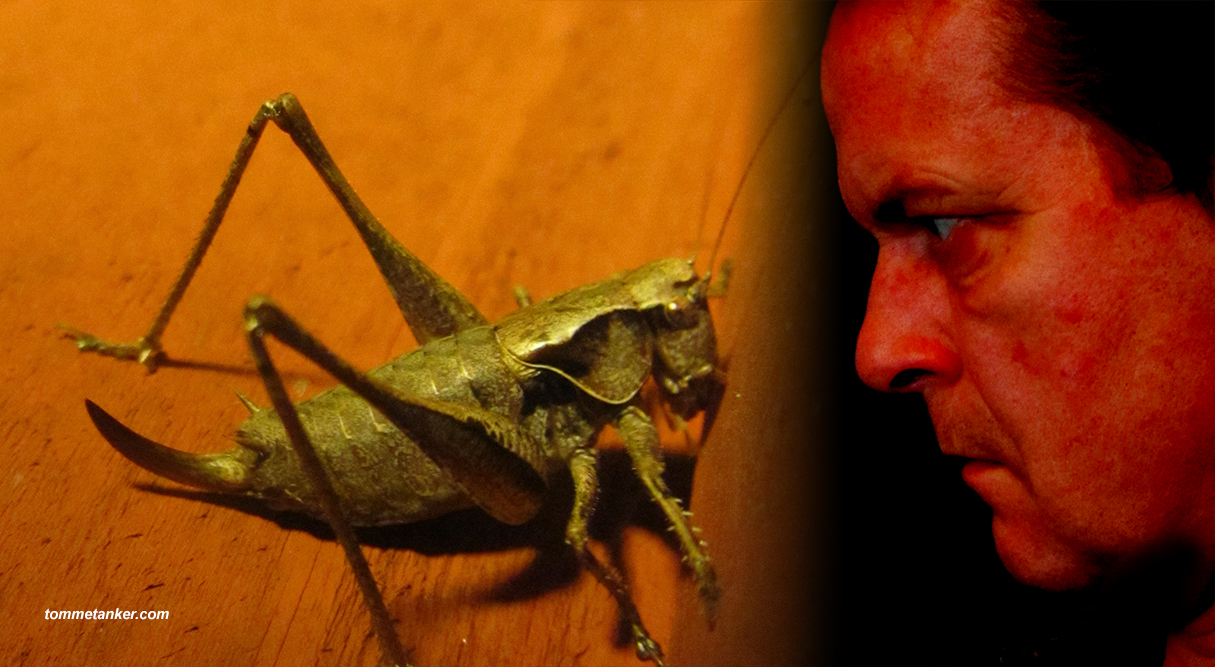 Lydene kom etter mørkets frembrudd i går. Og det er mørkt på hytta. Utenfor innerveggenes lysende trygghet er det mørkt og fuktig. Ut av vinduene ser en ingenting. Bare svart hav, svarte silluetter og svart mørke. Tap, tap, tap. – – – – – – -stillhet. Gudd! Det er noe som går på veggen. Tap, tap, tap. Knirk. . . . Jeg er ikke mørkredd. Tap, tap, tap. Mørket er ikke farlig. Det som er farlig er muligens det som går på veggen. Tap, tap, tap. Men som mann i huset må jeg ut. Jeg må overvinne angst, reddskap, feighet og livlig fantasi. Forsiktig åpner jeg døra og titter nervøst mot veggen lydene kom i fra. . . . . . Gudd. Der satt den. 70 cm lang. Sikkert 3-4 kg tung. Muskuløs med panserskjold. Kanibalistiske trekk og spisse omventknær. Sleipe øyne og skarpe tenner. Og bevæpnet med en diger kniv ut av ræva. Gudd. Kanskje jeg skulle hente litt hermetikk. Skulle ønske jeg ikke hadde fantasi.
