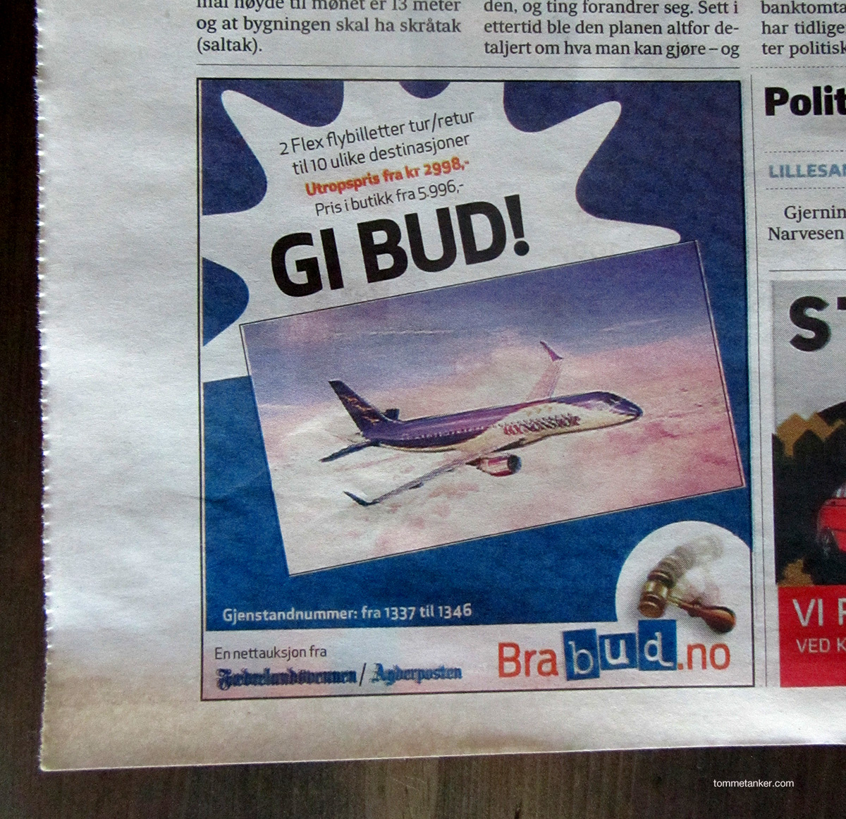 flynonstop_tommetankerDet er en tristhet over Kristiansand i dag. Eller rettere sagt, det er en tristhet på bakken i Kristiansand i dag. Fly NonStop har meldt oppbud fordi det ikke var nok oppbud av folk som meldte seg til Fly NonStop. Selv har jeg ikke flydd med de, men de som har – skrøt dem opp i skyene. Dessverre er ikke skryt nok til å holde dem på vingene der oppe. Med en gründer tuftet på salg og suksess fra Hennig Olsen Is lå forholdene til rette kommersielt. Og som han selv sier; Vi klarte det kommersielt, men ikke finansielt. Og det har han rett i. På et lite år klarte denne mannen å skape en merkevare byen var stolt av. Alle visste om dem, og alle som brukte dem var overfornøyde. Men de overfornøyde var ikke mange nok. Synd. Jeg skulle gjerne reist med dem, selv om jeg foretrekker tog. Og litt sjebneforutbestemt var det en annonse i Fe-vennen i går. På dagen da de meldte seg konkurs. “Gi bud”. Vel. Kanskje reiser de seg igjen fra asken, slik som fugl Phønix. Eller kanskje NonStop er best på kino. Trist er det i hvert fall. Jeg begynte å bli stolt av dem jeg også.