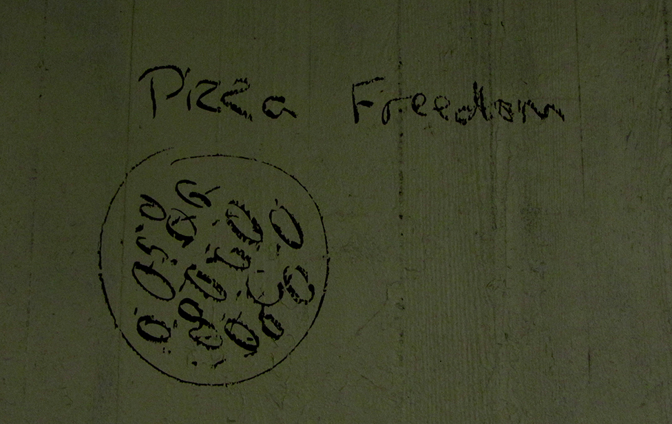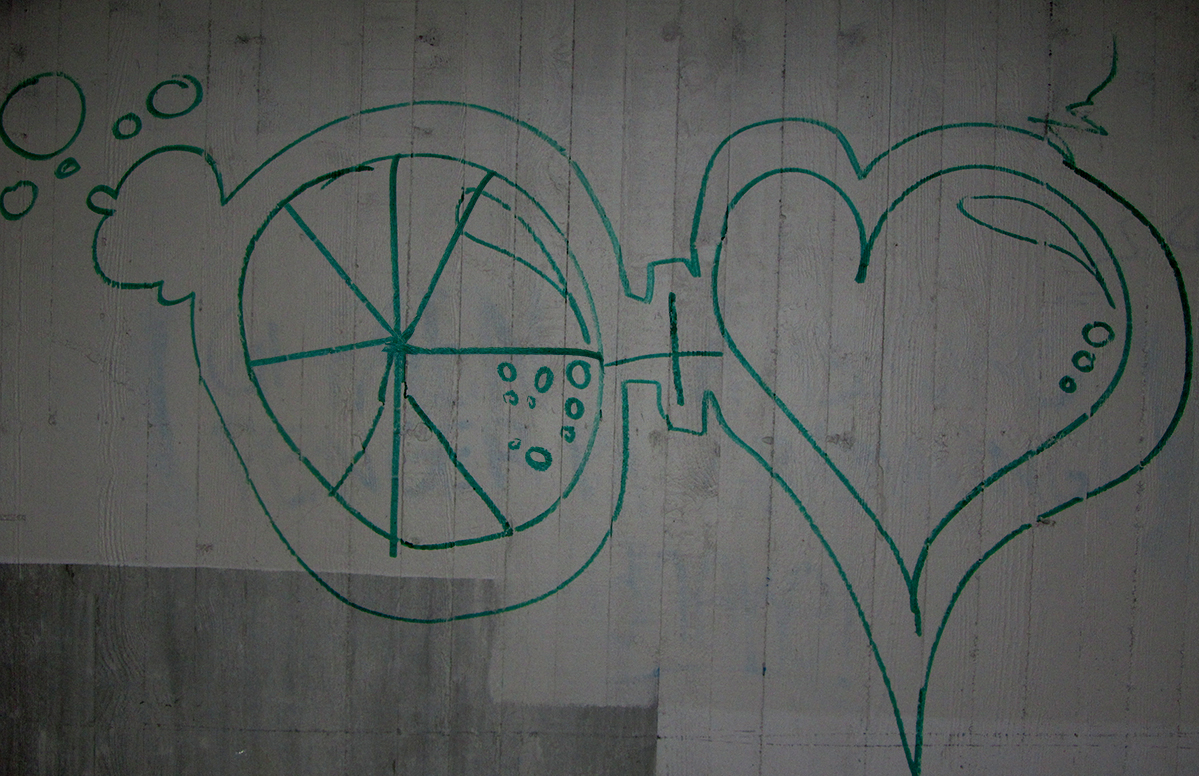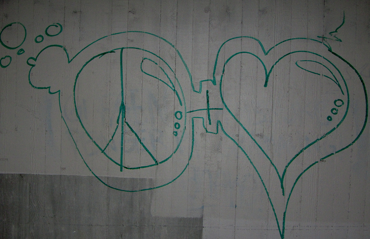 hos enkelte stedsbundne irritasjonsløse sprayboksentusiaster. Selv det offentlige trør til i denne taggetørka. Hver gang undergangen er tagget så lar kommunen det stå til pynt og stas et par uker før de lager nye “blanke ark” for våre håpefulle kunstaspiranter. Undergangen blir nygråmalt og taggerne kan igjen brette opp ermene og ta fatt . Men personlig synes jeg oppfinnsomheten har gått ned. I gå r var det Pizza Freedom som gjaldt.” Gode gamle Peace & Love var også der. Men med litt kreativitet kunne denne blitt koblet mot pizza freedom. Så enkelt, så enkelt. Nei taggerne trenger tips. Eller er dette rett og slett taggernes undergang?