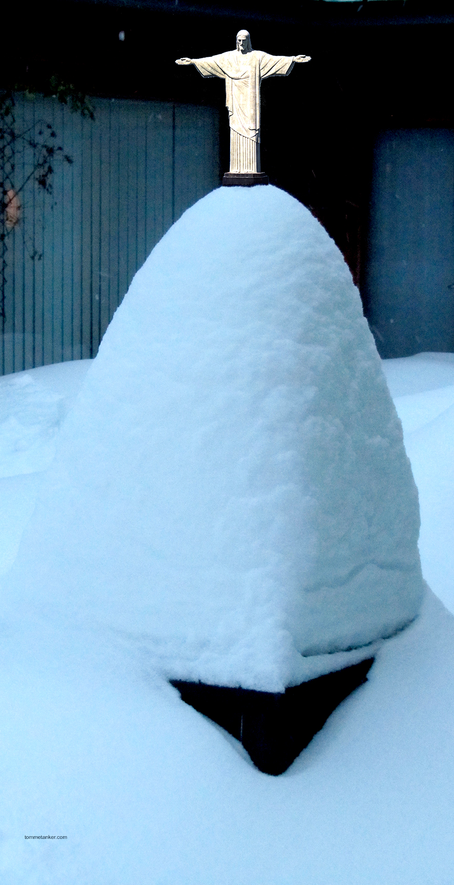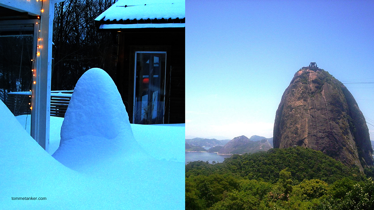 Det er lov å drømme seg vekk, fantasere,- og enkelte snøhauger skal bare ikke flyttes på. Til det er den iboende assosiasjonsgleden for stor. Etter et par timers snømåking uten å tenke på annet enn ingenting nådde jeg atriumet. Vår innelukkede hellelagte lille sommerplett med utestue, tønnegrill, kosepeis og blomsterbed. Et sted under snøen har vi alt dette. På sommeren er det der. Det var utepeisen som tok meg til Rio. Jeg har ikke vært der før, men i går reiste jeg. På tomme tankers måte. På første klasse. Uten jetlag og solfaktor. Og om jeg ikke hadde blitt varm av snømåkinga ble jeg det nå. Rio! Rio De Janeiro! Skummel jungel, varm sand, varme mennesker, svettende karneval og yppig musikk. Luktene, lydene og formene snek seg inn og til og med Jesus var der et øyeblikk og velsignet stunden.