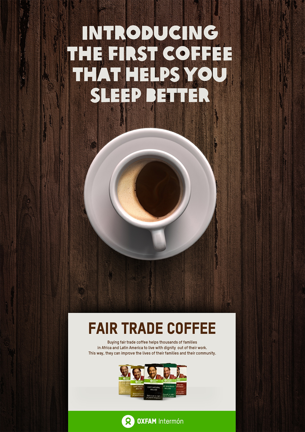 “Introducing the first coffee that helps you sleep better. Fair Trade coffee. Buying Fair Trade Coffee helps thousands of families in Africa and Latin America to live with dignity out of their work. This way, they can improve the lives of their families and their community.”