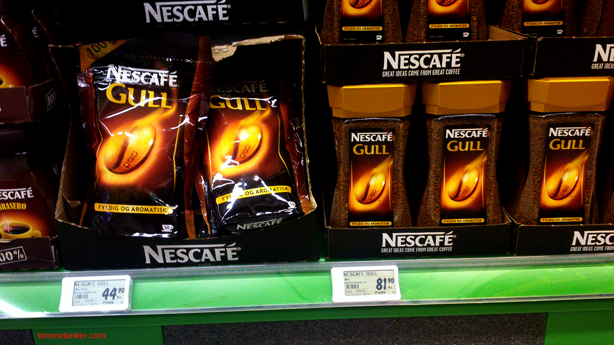 Den grønne glede. Spar penger. Kast mindre. Kiwi. De som gir deg dobbelt igjen dersom du finner en utgått på dato vare. Finner du et råttent eple, får du også dobbelt igjen. To råtene epler? De prøver å være en “grønn” variant av matvarekjedene. En hvor du blir tatt vare på og ønsket velkommen og får god samvittighet. Og jeg liker Kiwi, jeg handler der mye og de tar godt vare på store deler av lønna mi. Kjapt, trygt og billig – Kiwi, Kiwi. Men i går falt noen illusjoner. Det saken dreier seg om er refill. Jeg trodde nesten jeg var refull når jeg så prisen på refill. Jeg nyter ofte en kopp kaffe før jobb. Og da bruker jeg pulverkaffe. Kjapt og enkel kaffe. Her en dag var det tomt, og jeg førte “pulverkaffe-refill” opp på den 235cm lange påskehandlelista. Ved kaffehylla fant jeg min refillpose. Og jeg velger ofte refill da jeg uvitende nok vurderer det som litt rimeligere og det varmer mitt resirkulerte sinn. Kaffe i pose er billigere kaffe i glass, tenkte dumme jeg. Spar penger, kast mindre! som Kiwi selv sier. Vel. Det var her jeg nesten ble lurt. Jeg kjøpte nesten refillposen. Men så oppdaget jeg prisen. Refillkaffen er 40 kroner dyrere pr. kilo. Forstå det den som kan. Kiwi lurte meg ikke denne gangen. Men noen Kiwi illusjoner forsvant den dagen.