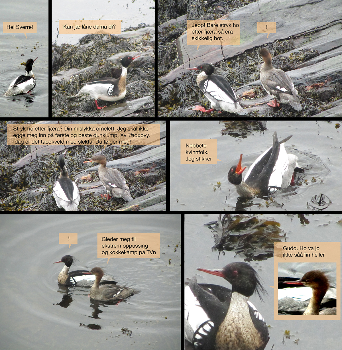 Utenfor hytta er det akkurat som russetreff om dagen. Det flørtes og parres blant holmer og knatter. Guttene slåss om damene, og damene spiller kostbare så lenge de orker. Som små speedbåter fosser frustrerte menn etter lettsvømmende damer. Og til og med de damene som ser ut til å være godt etablert får ekstrem oppmerksomhet. Vårkåte nebbete ungfugler uten selvinnsikt tar fart og hiver seg inn i jakten på det motsatte kjønn. Driften er stor. Det er mai og saftene syder.