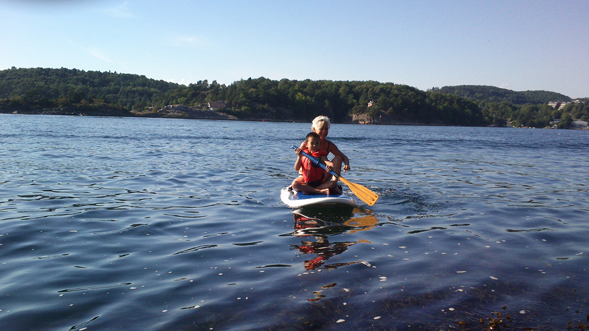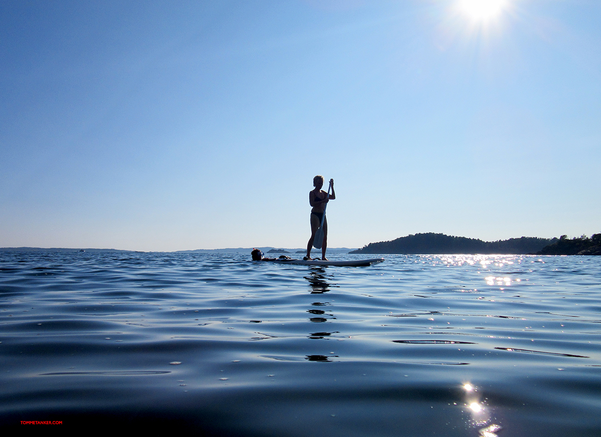 Der ingen skulle tru at hun kunne stå. Hun er en engel som kan gå på vannet. Og ikke bare når fjorden er igjenfrosset. Og det er klart det hjelper når det er 22 grader i vannet. 28 grader i lufta og motiverende og beundrende barnebarn er på besøk. I tillegg ei venninne og en sprek nevø. Allikevel. Maya er kalt mye pent, men aldri ei badenymfe. I vår slekt er det jeg som har gjeller og form som en mett torsk. Det er jeg som har vokst opp i Tretjønn og Korsvikfjorden. Men i går var en perfekt sommerdag. Gudd. Og plutselig var hun der, midtfjords. Stående på brettet og lystig ustødig padlende. Med nevøen nervøst passende på. Det er sommer, og den fortsetter.