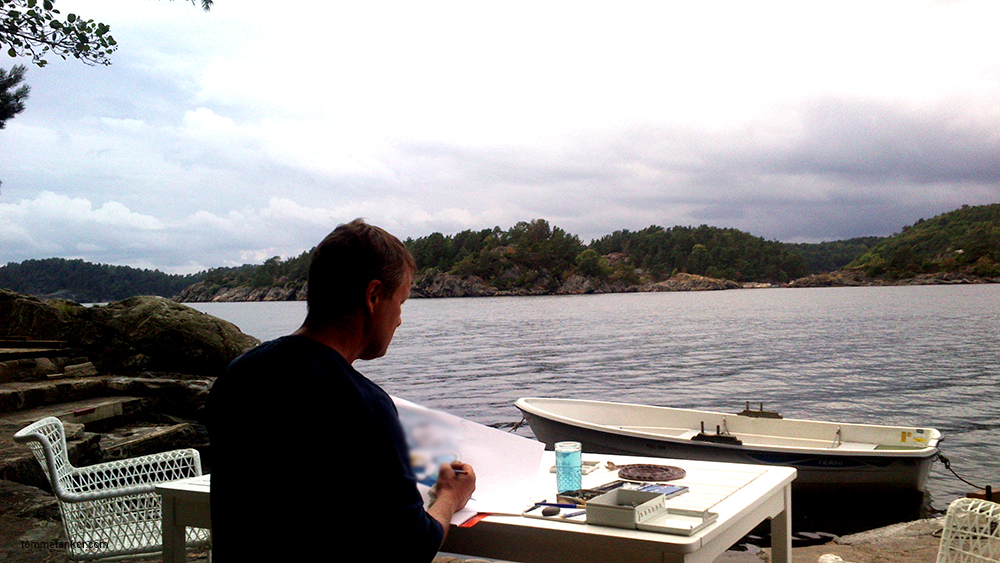 Når overtiden strekker seg inn i og ned i og ut over horisonten er ikke tiden helt over allikevel. Med overtid mener vi jo den tiden som går ut over den normale arbeidstiden og den vi forbanner langt inn i navlestrengen. For noen er overtid Pizzatid, men ikke for meg. Normalt er overtiden tiden som arbeidsgiver pålegger oss, slik at vi går glipp av 2 episoder med Hotell Cæsar og 3 med sinnasnekkeren, og muligens et svigermorbesøk. Vår ellers så meningsfulle og rikholdige tidsbruk blir avbrutt av arbeidsgivers behov for mer tid. Det er et gnål noen ganger, og noen ganger ikke. Ikke for meg. En finfin overskyet dag sitter jeg nede på brygga og jobber overtid. Ei håndvarm øl, litt frisk frukt og bølgeskvulp akkopagnerer mine penselstrøk. Vannfargene trives i nærheten av sitt rette element og hjelper meg til å lage det som både penselen og hodet vil. Inne fra mine tommetanker et sted siver det ut noe groms som til slutt kommer ut av penselen og ned på arket. Hva jeg maler kan jeg ikke vise. Det er en overtidsbestemmelseshemmelighet. Men mens jeg sitter her nede og jobber overtid går virkelig tiden over. Den forsvinner.