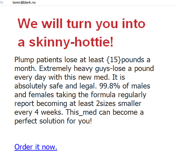 Alt finnes i “skyen”. Alt jeg gjør. Alt jeg kan. Alt jeg ser på og alt jeg ikke ser på. Og vår vidunderlige teknologi sørger for at jeg får annonser og reklamer og e-poster som er tilpasset mitt liv. Jeg trenger ikke lenger tenke på hva jeg trenger. Jeg kan bare se i inn-boksen og google-siden og facebooksiden og bloggsiden. Der står det nettopp hva som trengs for at min kropp og mitt sinn skal bli innhyllet i velvære, trivsel og selvrealisering. Og nå vet jeg altså at jeg skal bli en “skinny hottie”. Jeg gleder meg noe så inni helsike. Dette middelet skal jeg prøve. 2 størrelser mindre hver 4. uke. Det betyr at jeg ved juletider neste år er helt forsvunnet. Men inntil da må du forberede deg. Dersom du møter en som hilser på deg som minner om meg så er det sannsynligvis meg. Bare i en annen form. Ikke så aquadynamisk passgangaktig plump og treig slik du kjenner meg, men det er meg. Jeg har bare transformert meg selv til: Tomm – The Skinny Hottie.