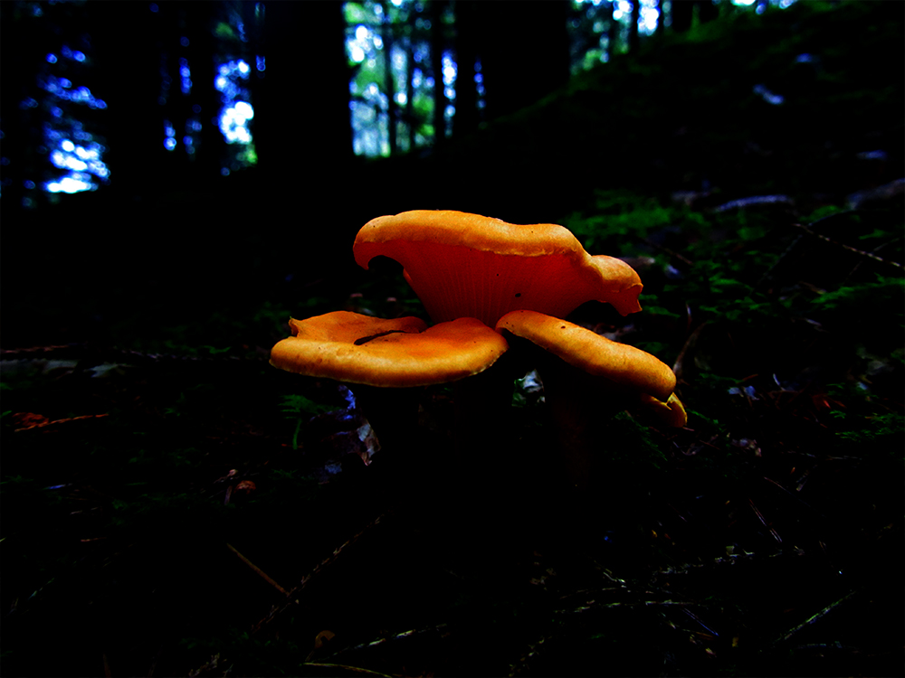 En stille vakker kveld. Klokken har passert 1900 og solen forbereder seg på leggetid. Innimellom krokete eiketrær og stramme grantrær smyger solens siste lange stråler seg. De strekker seg helt inn til kantarellene jeg fant der inne, innerst i den tette granskogen. Solen rakk akkurat å vise hvor de Orange delikatessene stod og gjemte seg før den klatret opp i tretoppene og fløy av sted. Det er dønn stille. Ikke ett vindpust rasler ider oppe. Ikke en bil langt vekk en gang. Ikke et fly på himmelen. Heller ikke en sky. Kun skogens lyder av stillhet og ro. Kun de små