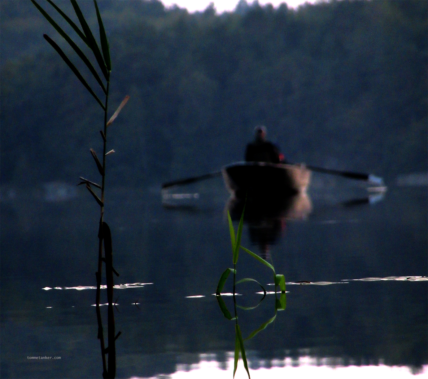lydene. En kongle som faller. En mus som krasler under bladene. Myke kjappe vingeslag fra småfuglene. En liten bekk klukker det borte et sted. Det gjør at mine tomme tanker tømmes helt. Det er fullstendig ro. På en tørr liten moseflekk satt jeg med lukkede øyne og beriket meg selv på skogens stille magi. Jeg hørte en ny lyd etter hvert. Langt borte. Taktfast men stille. Jeg fulgte lyden og gikk over en liten kolle. Helt til jeg så utover Sukkevann. Stille her osåg. Og langt der borte kom en som også hadde funnet roen. Ro i skogen. Så flott.