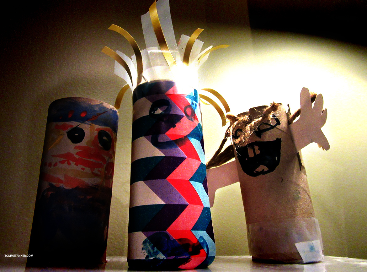 Jeg er glad jeg ikke er en dorull. Først er du varm og god. Innehyllet i den mykeste lammecellulose. Godt kledd og sammen med vennene dine, gjerne seks stykker, i en pose. Det er sosialt og fint og fremtiden ser lokkende lys ut. Det er jo tross alt innen helse og velværesektoren du jobber. Men når dagen kommer og du skal tre inn i den oppgaven du er skapt for, kommer overraskelsen. For det første blir du helt alene. Dernest blir en trepinne, eller muligens en metallstang stikket gjennom kroppen din. Og sakte men sikkert blir du avkledd i et miljø hvor promping og fising hører hjemme. Hele tiden mens du er svimmel av alle omdreiningene i holderen du er låst til. I det du er helt naken er det ikke lenger nytte for deg og du tror du skal gå til behagelig resirkulering. Ikke alltid. Noen ganger kommer bestefar og en 5 åring og en 7 åring og gjør deg om til noe surrealistisk skummelt. Livet etter døden er ikke alltid så rosenrødt for dorullene.