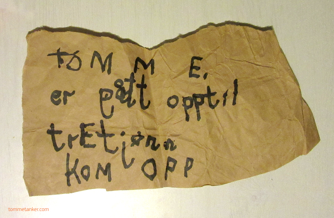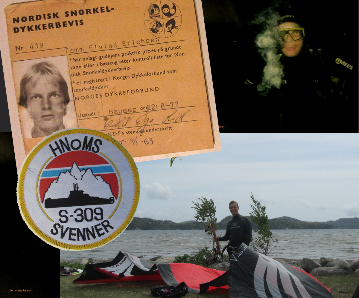 Min fornemmelse for vann startet tidlig. Jeg har seilt seilbrett ut Vestergabet før mobilens tid. Jeg har dykket i Cenoter i Mexico. Jeg har svømt med ville delfiner utenfor Zansibar og med skillpadder i Indonesia. Jeg har stupt fra 11 meter. Jeg har hoppet fra 16. Jeg har lært å kite i voksen alder. Jeg har fler mageplask med magefett enn jeg tør tenke på. Jeg tjenestegjorde på U-båt i Marinen. I Orlando var jeg i badeland med Pamela Anderson (riktignok stod hun på bassengkanten, men allikeve)l. Og rett ved Treungen finnes verdens fineste naturlig vannland. Jeg har til og med snorkeldykkersertifikat. Who has’nt? Og min forelskelse i vann tror jeg startet på toppen av Gimlekollen. Jeg tror det hele startet med jublende, hvinende, hoppende glade kamerater i Tretjønn. Like etter at bleiene forsvant kom badebuksa på, og med gode klassekamerater tilbragte vi sommerens lyse timer på Eneren, Toeren og av til Treeren i Tretjønn. Like mye i luften som i vannet som under vannet. Og i en ryddekassesorteringstime fant jeg en lapp mine foreldre hadde spart på. Datidens SMS. Det var visst mange av denne typen beskjeder når mamma kom fra jobb. Jeg elsker fortsatt det våte element og gleder meg til sommeren. Håper det blir en kopi av den som var. I mellomtiden får jeg gå litt på vann i form av snø.