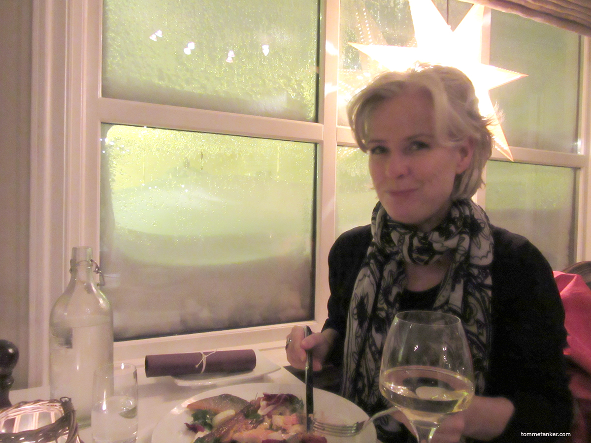 Ikke lenger nå. Nå har den blitt til en flott liten restaurant. Akkurat passe stor, og akkurat passe koselig og veldig god service. Og bak skranken, bak døren, finnes det en utmerket kokk. Han fikk vekk smaken av snøen som hadde blåst inn i ører, nese og hals. Den ble erstattet med nytelse og velvære. Min kone hadde fisk og jeg hadde kjøtt. Hun hadde vin, jeg hadde øl. Alt var godt.