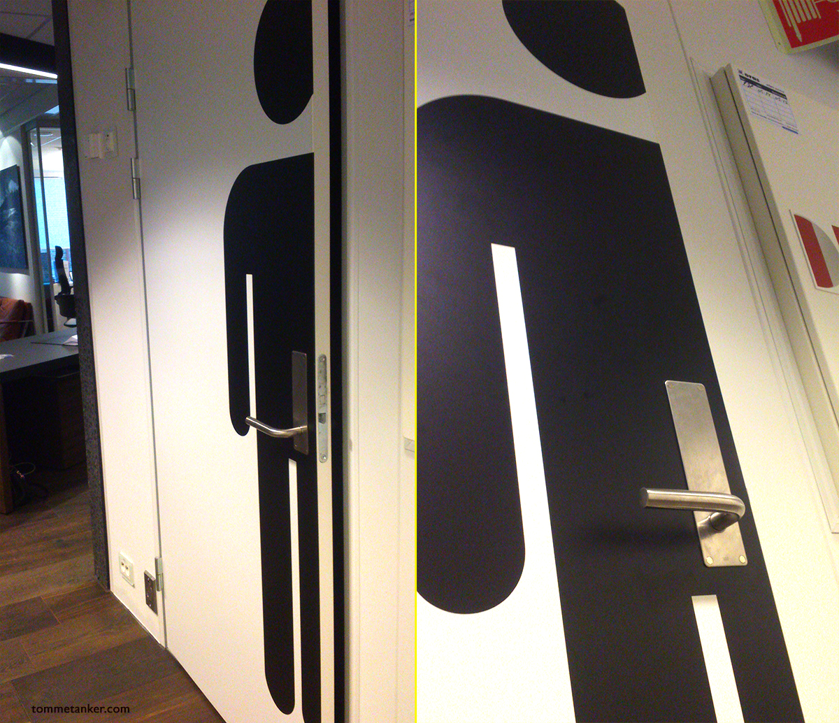 En skal være forsiktig med hvor en hviler hendene. Og dørhåndtak blir kanskje ikke helt det samme etter dette. Jeg er hverken homofob eller tvangsvasker med frykt for støv og døde hudceller, men da jeg her en dag stoppet opp i korridoren på et kontorbygg på jakt etter toalettet fikk jeg meg uønskede bilder plantet inn i hodet. Foran meg i gangen stod to menn og pratet. Den ene var på vei inn på toalettet, men hadde aldri helt gått inn gjennom døren. Han hadde blitt stoppet av en annen og endt opp stående med den ene hånden hengende på dørhåndtaket mens han pratet med en kollega. Og der stod altså jeg. Jeg skulle også inn den døren. For det var jo en mannedo bak den. Men hva skulle jeg si: ” Slipp kuken slik at jeg kan passere.” Vel jeg turte hverken si det eller ta bilde av karen, så jeg ble stående å vente lite grann med homoerotiske bilder i hodet. Helt til mannen festet grepet og dro håndtaket hardt nedover så det føltes vondt og dro det til seg. Jeg slapp inn og gjorde mitt. I det jeg gikk ut dyttet jeg døren forsiktig igjen,- med foten.