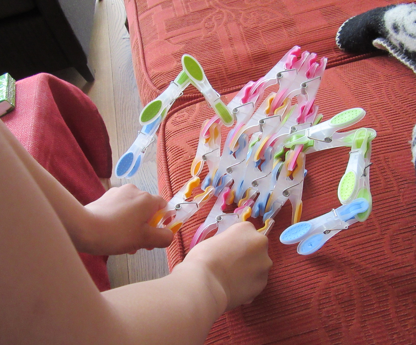 Vi skule hengt opp klær, men det ble med tanken. Kles-snor ble ordnet og strukket og klesklyper ble innkjøpt. Men der stoppet det. For Klesklyper trenger ikke helt å være klesklyper for et par småtroll. Inne hodene til barnebarna har klesklypene fått nytt liv. I en fantastisk fantasiverden dannes det krabber og fly og sommerfugler og monstre og innsekter og en haug med andre skumle skapelser.