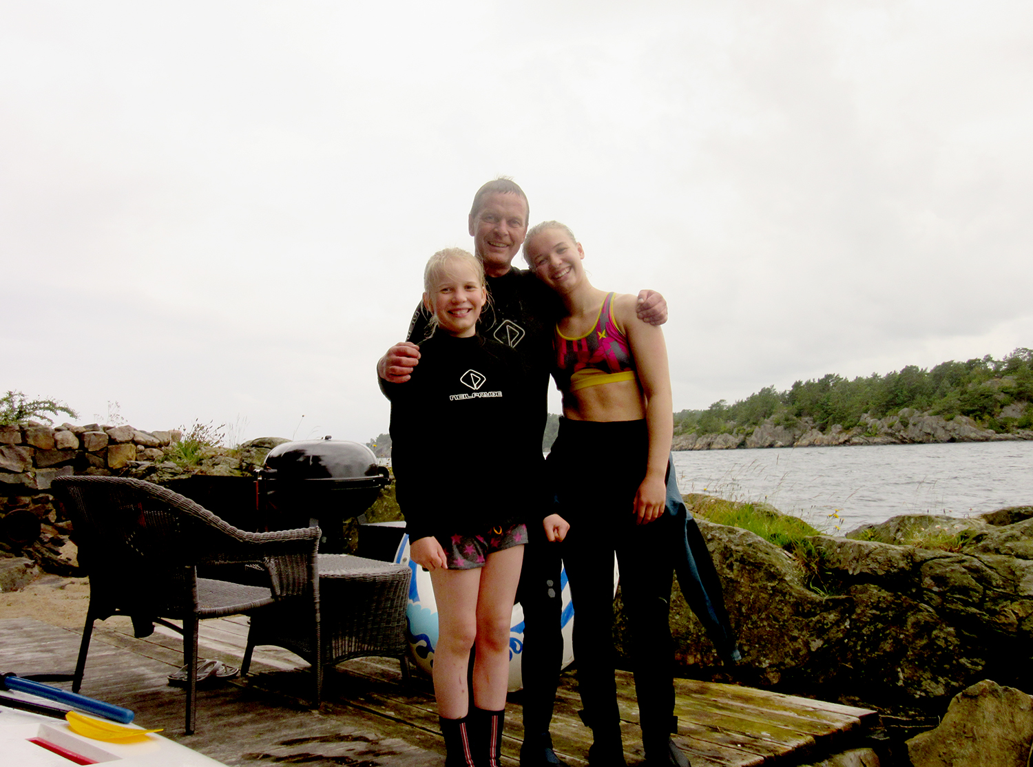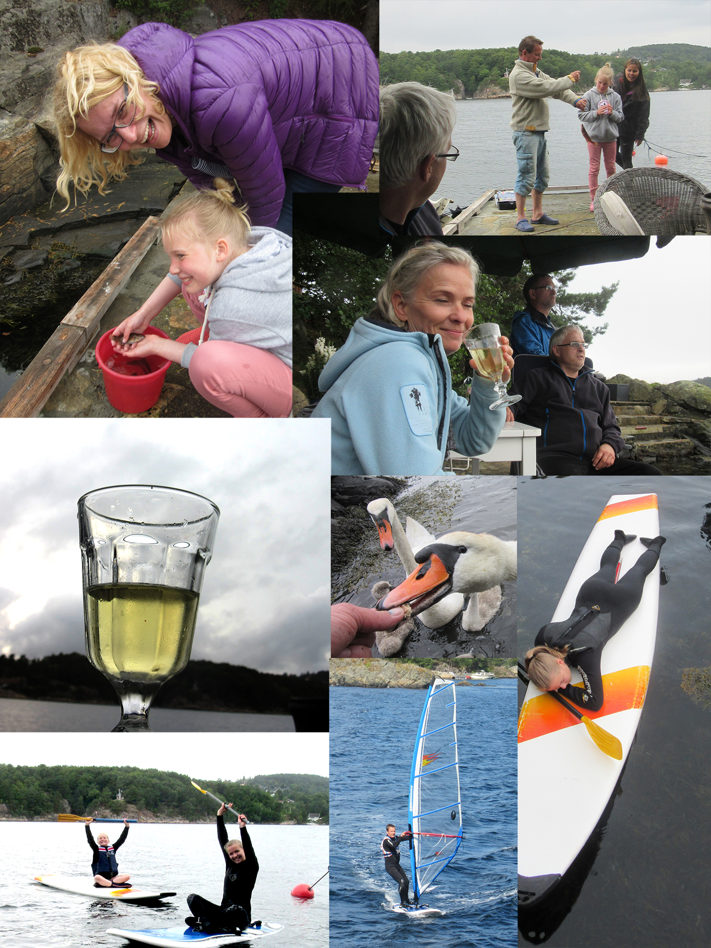 Det blåste. Det regna. Det var grått og ikke så kaldt. Sørlendingan trakk innendørs og klaginga starta. Kommer aldri sommeren. Hvor blir den av. Det trekker. Der er utlendinger på campingplassen. Rægane æ for dyre. Mange av søringan trakk inn i sine respektive bedehus og bønnenen fylte lokalene; “Det er grått, det regner, Oh kjære gud, har du forlatt oss. Gi oss solskinn, for . . . . . søren.” Jeg vet ikke om bønnene hjalp for dem, men det hjalp for oss,- vi fikk besøk fra Nord. Fra folk som er vandt til maxtempraturer på 12 grader eller der om kring. Fra fin familie som er vandt til å “stå han av.” Det var som 4 soler kom til hytta vår. Wenche, Rory, Ragnhild og Ingeborg. Været vi hadde i går akkurat da, var det vi hadde i går akkurat da, så vi lot som det var sol og kjørte på. Vi bada og seila og grilla og fiska dumsnille bergnebber og satt krabbeteiner og rodde en tur og mata svanefamilie og sommermåker og oss selv. Og når alt dette var gjort kom Gunnar og Wanida og vi måtte gjøre alt om igjen. Når klokka blei halv ti forstod vi at denne dagen var dessverre alt for kort. Ragnhild måtte vris opp av vannet og Ingeborg var nysalta og klar for litt søvn. Dagen hadde gått så alt for fort. Vi hadde det altfor gøy. Vi burde invitert noen vi ikke likte for da virker dagen såmye lengre.