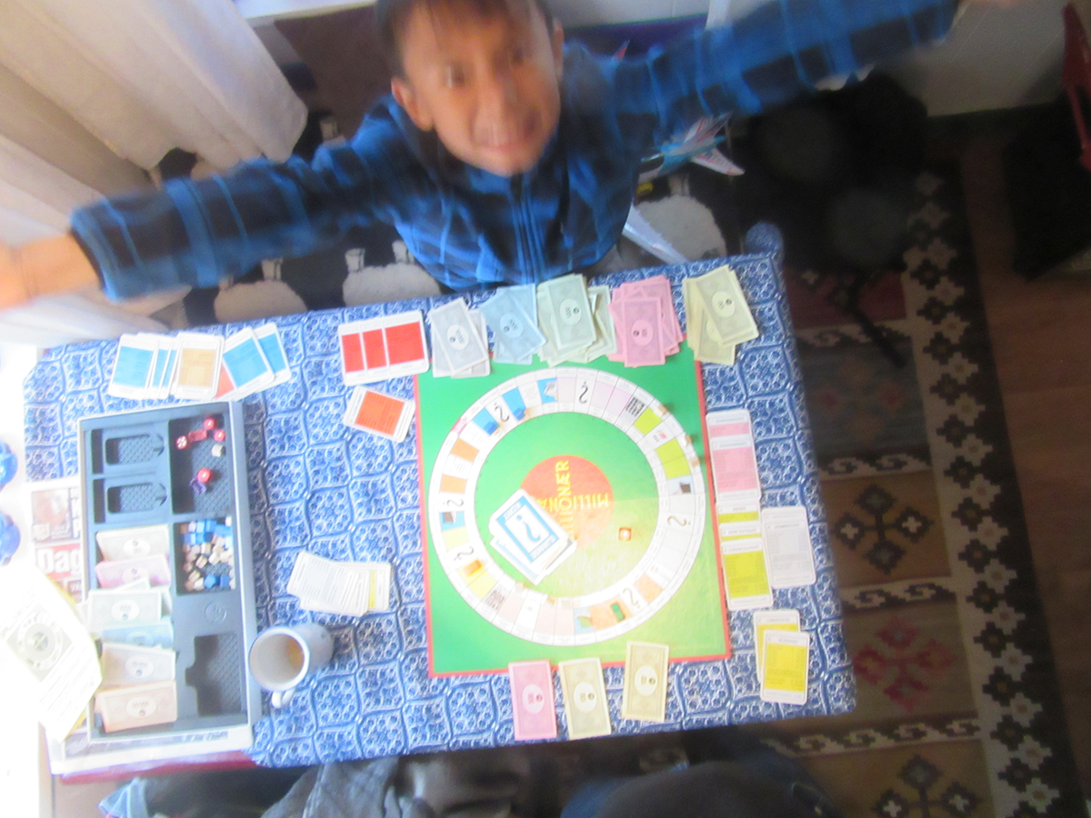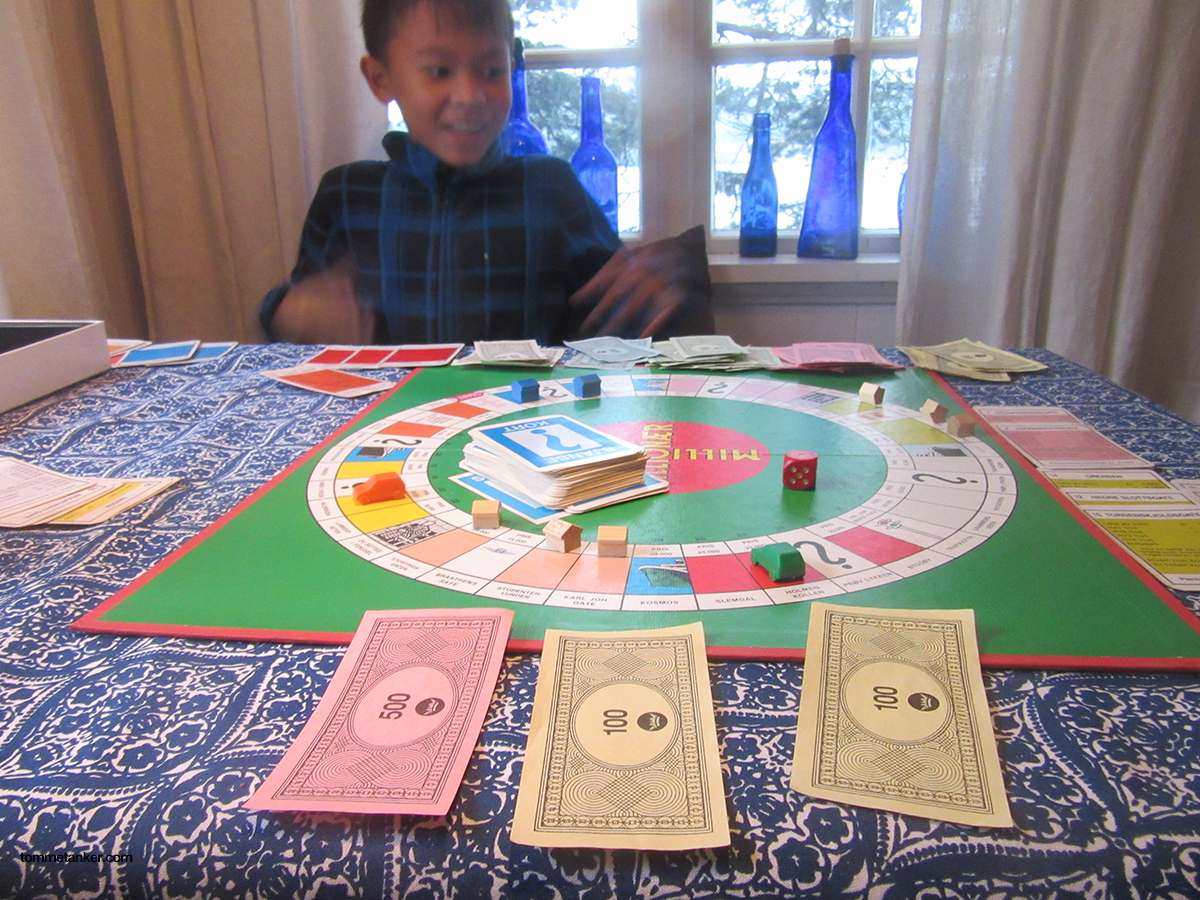 Han ble millionær, jeg ble milliofjærn. Banka av en 8-åring. Dritflaut men sant. Mens jeg er av den kunstneriske sorten har den vesle kroppen fått et matematisk hode. Allikevel. Han er bare 8 år mens jeg er gammel. Min livserfaring + kjøp og salg av leiligheter og boliger opp igjennom burde gitt meg den fordelen som trengtes. Jeg har til og med fullført videregående skole, samt et tilleggs-år på Risør Husflidskole. Han går i tredje klasse. Det er forbaska irriterende å sitte der å se at han bygger hotell på Kirkeveien og Parkveien, de to dårligste gatene i hele spillet. Jeg sier til han at det kanskje ikke er så lurt. “Jammen bestefar, de er så fine og blå, og ligger rett etter start.” “Dustesvar”, tenker jeg, men sier det ikke høyt. Etter noen runder i spillet og kast med terningen sitter jeg igjen med 700 kr, og pantsatte gater. Og mitt neste terningkast førte meg for 6 gang på kort tid til et hotell i Parkveien, som 8-åringen over bordet jublede eier. Hvordan i huleste er det mulig. Jeg gikk dundrende konkurs etter hotellbesøk på den mest elendige gata i hele spillet. Og for å gni det skikkelig inn løper han inn til bestemor og forteller hvor dårlig jeg er. Neste gang han vil spille noe skal jeg finne frem Scrabble,- på tysk.