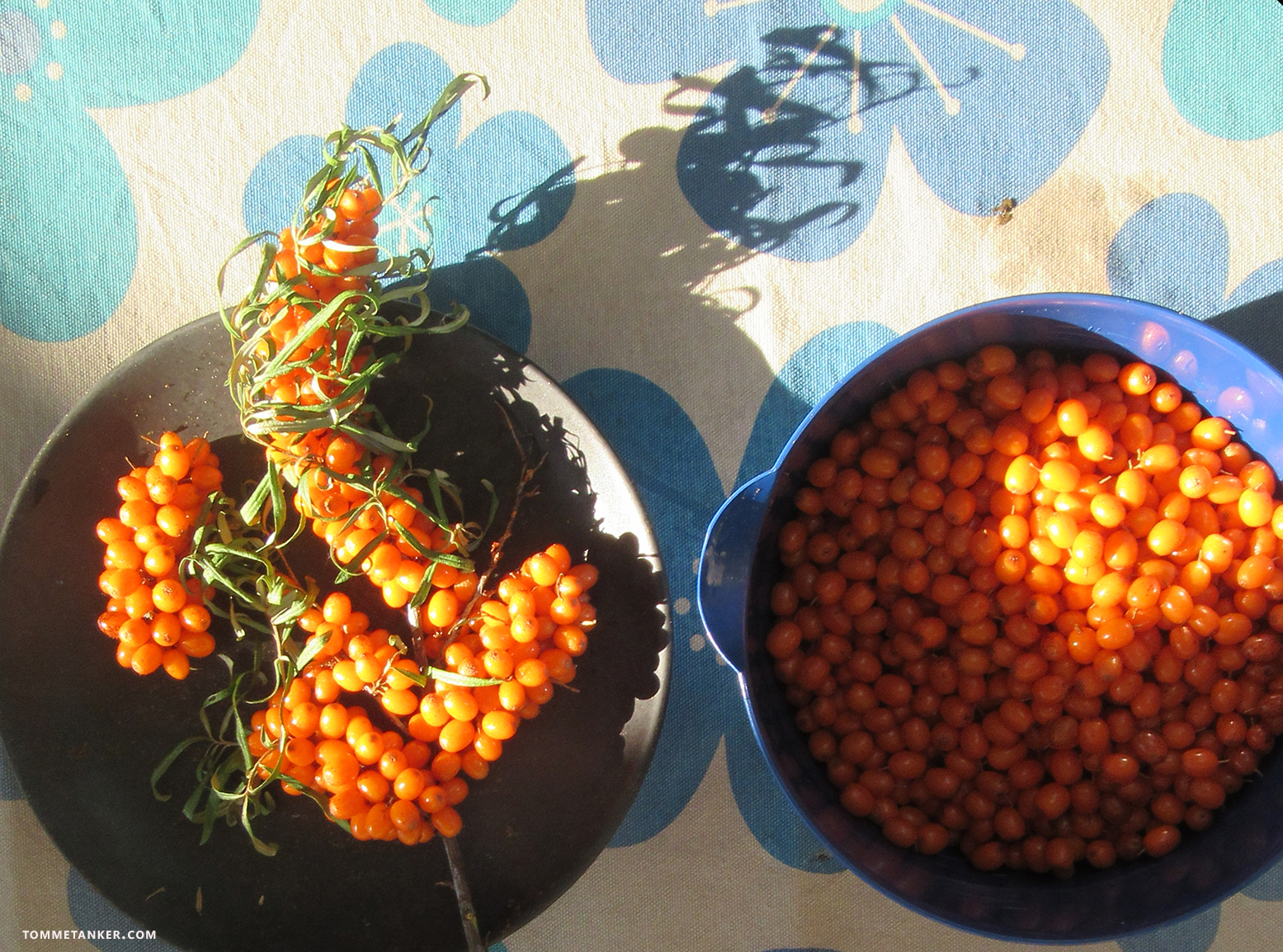 Ahhhh. Det er september og Hippóphae rhamnoides modnes i hagen. Disse hardtsittende Orange fristelsene. Også kaldt Tindved, Tinnan, Tinne, Tinnved, Tørn, Tørri; Tænnved eller rett og slett Støggved. Ingen pene navn her så jeg liker å bruke det de kaller buskene i Danmark og Sverige,- Havtorn. Det svinger litt mer av det navnet syntes jeg. De er gode men sure akkurat nå.