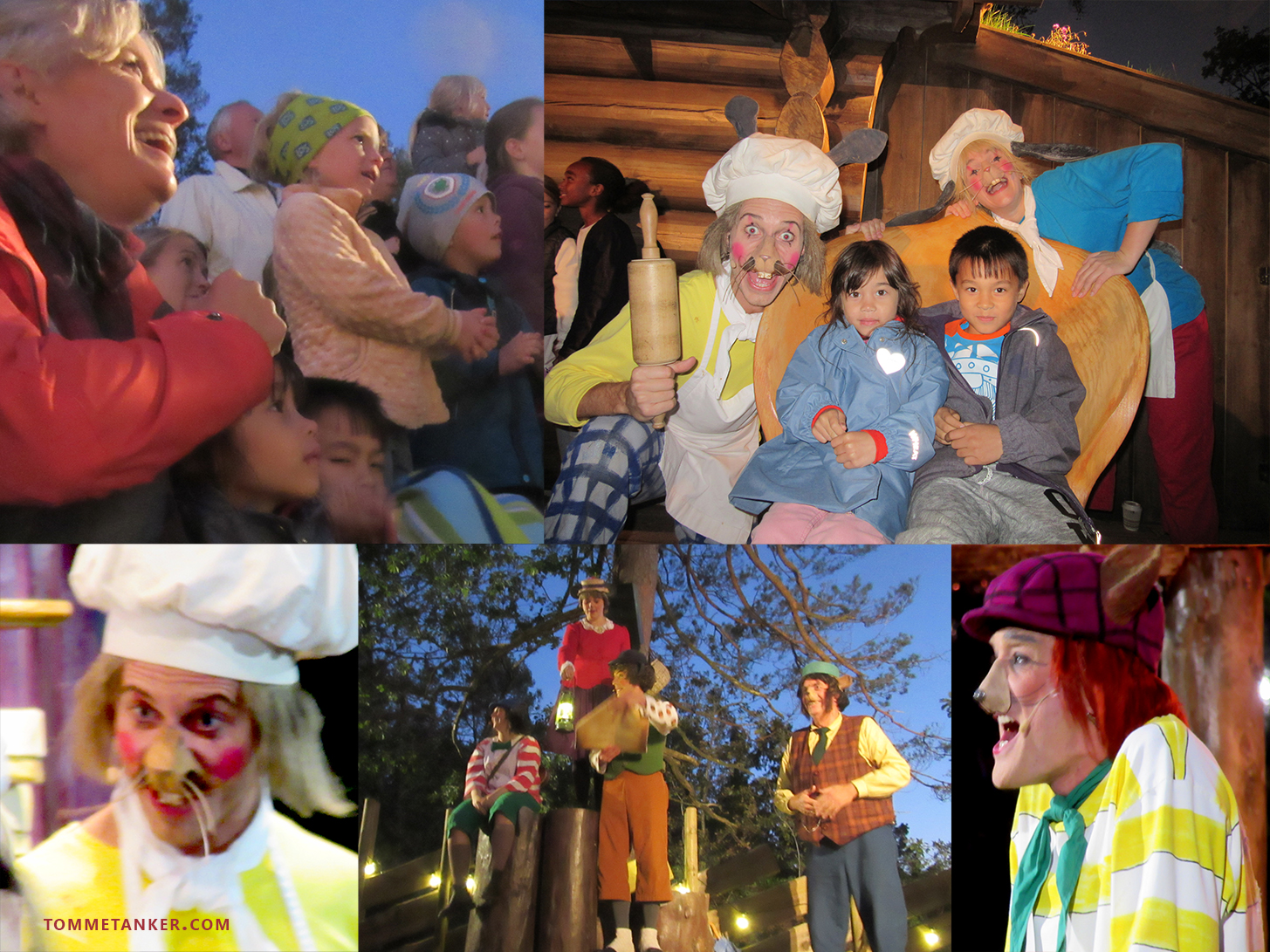Men jeg ble med. Inn i Parken etter stengetid, i 7 tia. Tuslende innover og oppover kom vi til inngangen til Hakkebakkeskogen. Og hodet startet å virke igjen. I stedet for å deppe, skulle jeg gi dette en sjanse. Det var litt kø, som er noe dritt. Men, det så flott ut innover. Inn i den skogen toget skulle gå. Og Gudd, hvor stor er ikke gleden når slike forventninger som jeg hadde ikke innfrir. Vi ble møtt av proffe menneskelige unge verter. Som gav oss god saft, gode pepperkaker, enda bedre kanelsnurrer og ikke minst;- kaffen smakte utmerket i solide kopper med lokk. Undrende fikk jeg også et fint sanghefte i hende før vi ble vist plass inni dette feilproduserte toget. Vognene var som små tribuner uten vegg og setene pekte innover mot skogen. “HÆ?”. Plutselig kom det et skuespillerekorn ut av skogen og ba oss slå av mobilene og bli med oss på turen. Og reisen ble magisk i denne vakre skumringsfylte oktoberkvelden. Langs skinnegangen utspilte Hakkebakkeskogen sin historie seg, med Klatremus og Reven. Bakermesteren og peppermetta pepperkakedeig. Pelle Pinsvin og Bamsefar som fylte 50 år i år igjen. Alt pakket inn med proff produksjon. God lys og god lyd og akkurat nok kulisser. Og skuespillerne gav mer enn bare skuespill, de gav av seg selv. Flørtet med oss passasjerer og fikk oss med inn i historien. Vi sang og brølte, flirte og skvatt, og barneøyne tindret som stjerner i natten. Jeg vet ikke hvor lang turen var, eller hvor lang tid det gikk, for vi var med på turen. Helt med.