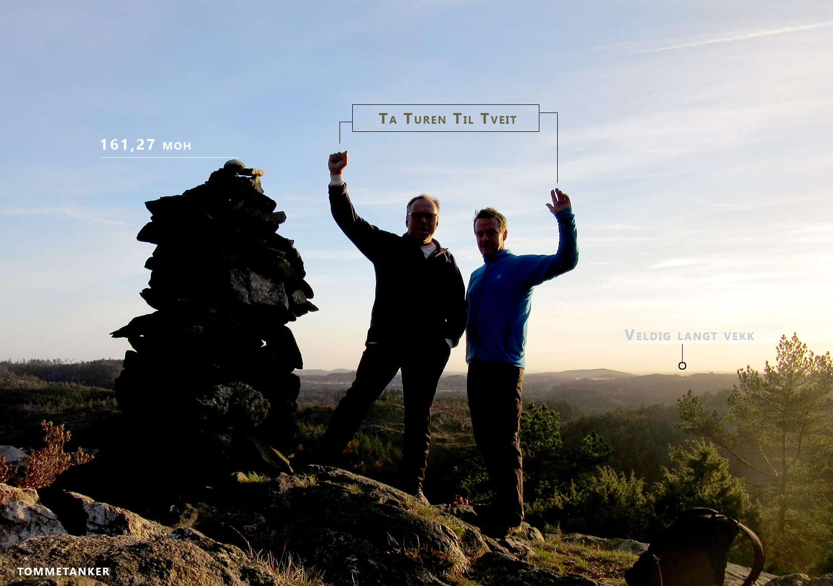 Jegersberg er fint og bymarka er smukk. Men prøv Tveit neste gang. Den Omvendte Båt er jo sjelden tom. Den må daglig øses for folk. Det er fint der, og lett å finne frem, men gudd. Du er aldri alene. Og litt alenetid på skogsturer er en nødvendighet. Muligheten til å lytte til en bekk. Tenke på en pinne. Titte bak et rotvelt. Det å kunne gå i egne tanker, og ikke andres. På Tveit kan du oppleve litt mer natur og mye mindre terrengkarusell-latexfolk. På Tveit finner du turer i fleng. Jeg gikk der i går. Til Havsyn, 160 meter over havet og like fin utsikt som Båden. Det var meg og Bjørn som gikk, og ingen andre. Det er usedvanlig godt merkede løyper, med skilt og kart og pekepinner og blåmerker. Og fra parkeringen innenfor idrettsbanene på Dønnestad er det mange retninger å velge mellom. Alle like godt merket. Ta turen. Opplev noen nye trær og trø ned i noen nye myrhull. Snubl i noen nye røtter og få nye innsikter ved nye utsikter. I tillegg er folk fra Tveit ganske hyggelige om du skulle treffe på noen.