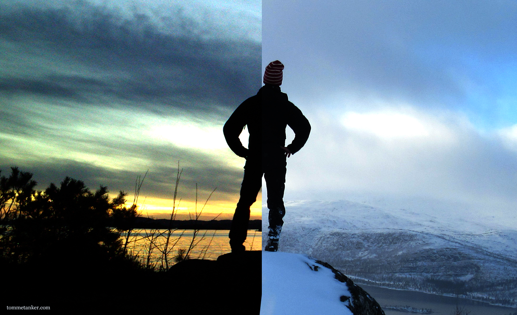På samme dag som Maya har vært borte en uke stod jeg i vinterlandskap. På samme dag står hun i sommerlandskap. Hun går i sandaler i høylandet i Brasil. Jeg stampet i 50 cm snø opp på fjellet på Hovden. Og mens hun kler seg lett med et lag luftig tøy, kler jeg meg tungt med tre lags tett tøy som puster. Hun har det fint. Jeg har det fint. Sammen har vi det fint, selv om vi ikke er sammen. Og samme dag som jeg stod på fjellet på Hovden stod jeg på svaberget ved hytta. Klokka 11 var jeg på en fjelltopp. 6 timer senere ser jeg på sola som går ned over Vågsbygd. Og samme dag som jeg ser 2 så ulike utsikter tenker jeg på Maya og hennes utsikter. Jeg har mine utsikter og hun har hennes og sammen har vi mange. Vi er heldige som bor i en verden med så mange utsikter. Håper bare at vi ikke mister innsikten.