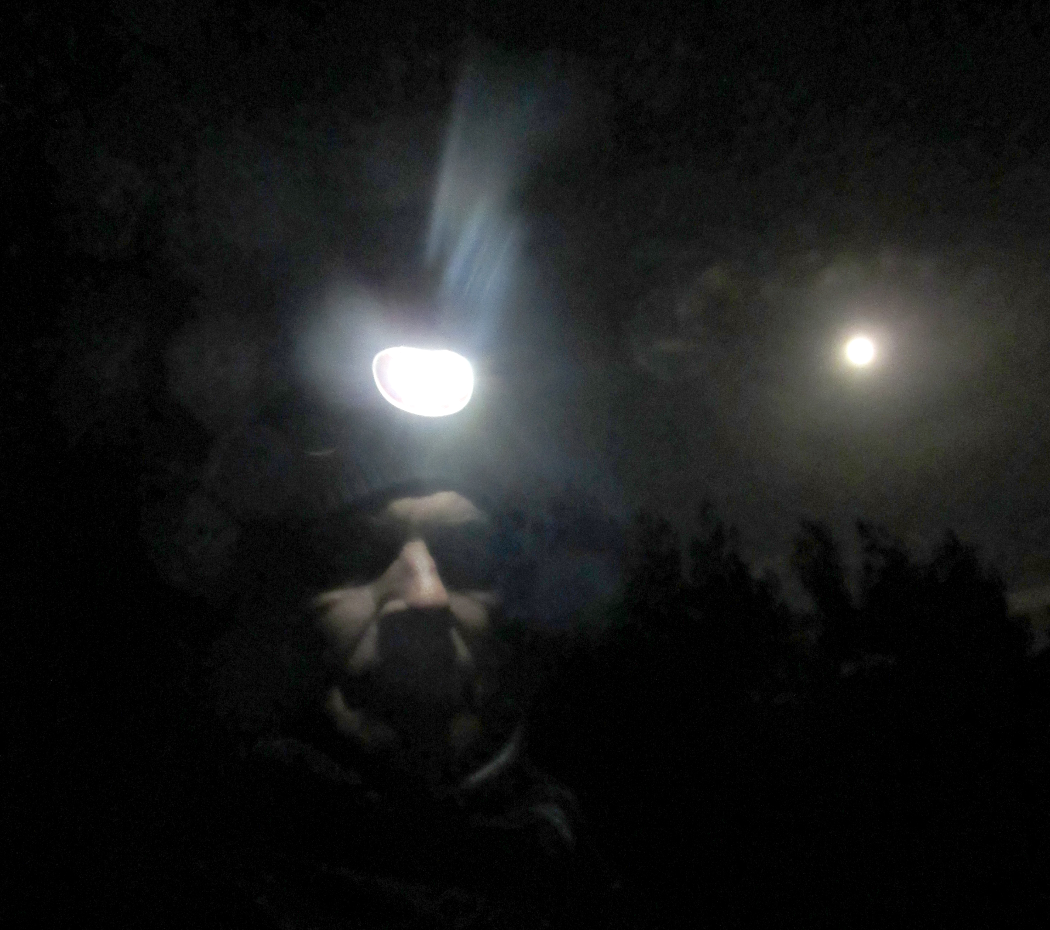 Hver søndag aften gir jeg meg fotballen i vold. Sammen med en gjeng dårlige kamerater gjør vi vårt beste for å avfinne fotball. Vi er på et nivå som vil forundre de fleste. I ønske om å skåre spektakulære mål vil jeg påstå at det eneste vi skårer er lavmål. Vridninger og vendinger som ellers ikke finnes i det vanlige fotballuniverset blir utfordret i en gymsal på Hånes. Dette sportens under er ikke for alle. Og heldigvis er det lukket visning. Voksne menn med behovsprøvd oksygenopptak burde egentlig ikke gjøre det vi gjør. Men vi gjør det allikevel, – for vi vet ikke bedre. Men i går gjorde skolens vinterferie det slik at det ingen dueller, med eller uten ball, ble utkjempet i denne altfor store hallen. Vi har treningspause denne uken slik at vi kan samle krefter til neste dyst. Derfor fant jeg heller fram et lys som jeg plasserte i panna og ble med månen på tur. Den lyste opp i en ellers mørk skog. Jeg gikk til Ruben i mørket hvor jeg tok selfie med mannen i månen. Og som en dritings giraff med ankelbrudd stabbet jeg meg over glatte røtter og is-svuller oppover og nedover stier. Mørket skjulte heldigvis mitt urytmiske ganglag der jeg gikk og var forbannet for at jeg ikke tok med meg gåstolen. Rent bortsett fra det kan jeg anbefale turer i mørket. En ny verden åpner seg. Både utenfor og innenfor øyelokkene.