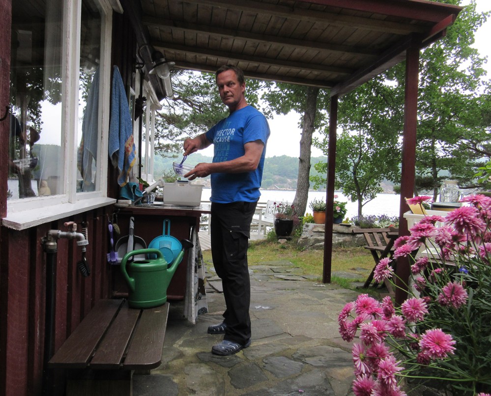 Det var ting i mitt liv som hadde blitt tilsjasket av fett og urenheter. Jeg var bestykket med skittent bestikk og de hvite koppene var bare hvite på utsiden. Det var rett og slett på tide å stoppe opp og tenke over tilværelsen. Ta seg selv i nakken og dra seg opp av senga. Fjerne kaffekoppen fra høyrehanda og erstatte avisen med kosten. Det var på tide med et oppvaskmøte. Min flekkete fortid skulle renskes opp i og med boblende lyst og Zalo satte jeg over en gryte med vann. Min spesialitet ved komfyren. Det er fint med et slikt møte en gang i blant. Tidsklemma åpnes helt opp til det ikke er noe press igjen. Et kvarter senere var det ikkeindukjonskokte vannet klart. Vår komfyr er av slowcook-typen. Så også når vannet skal kokes. Og jeg stod ved hyttas eneste vask som kun er 40 cm fra innsiden av hytta og vasket opp. Kniver, skjeer, gafler og et koselig vinglass som var fylt med Mayas prosecco i går kveld. For ikke å snakke om koppen som min venn Paul drakk kaffe av etter å ha overnattet i sjøbua etter konsert med Honningbarna. Der var også skålen som hendene mine hentet chips ut av. Alt har en historie. Og når hodet mitt først er av en slik karakter at jeg kan stå ved en snart tom oppvask-balje og ønske at det var mer, så er en oppvask i hytteveggen ikke noe pes. Det var en fin oppvask og når alt det skitne er rent og skylt er det godt å vite at jeg senere på dagen kan sette det inn i skapet,- soltørket.