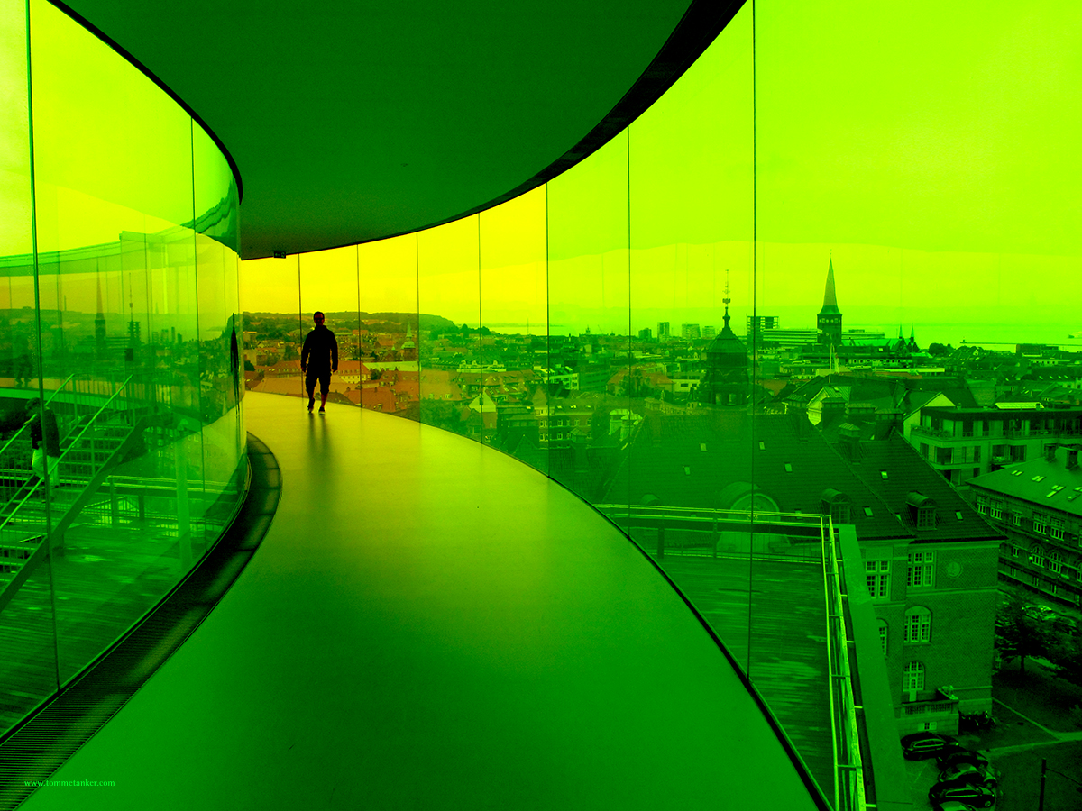 Jeg så den første dagen jeg var i Århus for noen år siden. Denne regnbuen av glass på toppen av en bygning, og tenkte; Der vil jeg gå, uten å vite hva det var. Og vi gikk. Min turkamerat var ikke tung å be. Vi måtte bare på festival først. Men så,- Tredje dagen. Opp en gate bort et sted og til ei dør. 100 kr ut a lomma og vi slapp inn. Det viste seg å være toppen av et ni etasjers kunstmuseum. En underlig opplevelse å ta heisen opp til Århus tak og få inn den flotte utsikten i alle fargene. Kunstneren, Olafur Eliasson forklarer kunsten sin slik: