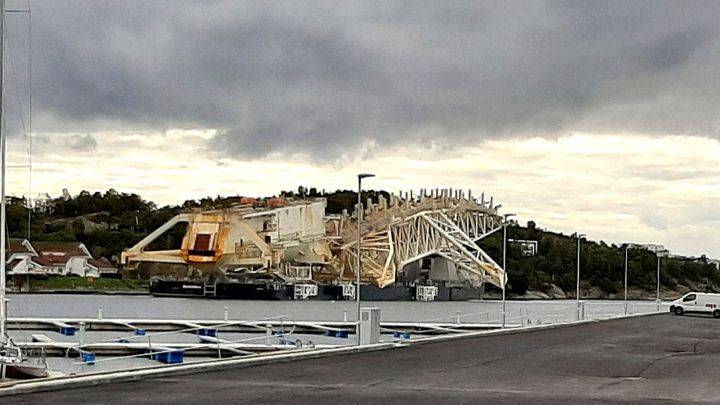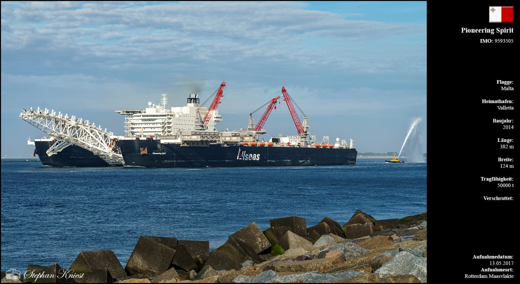 Den ligger tungt i sjøen. Det er et stort monster som preger manges utsikt . Superspeed er 211 meter lang og 26 meter bred. Pioneering Spirit er 383 meter lang og 124 meter bred.