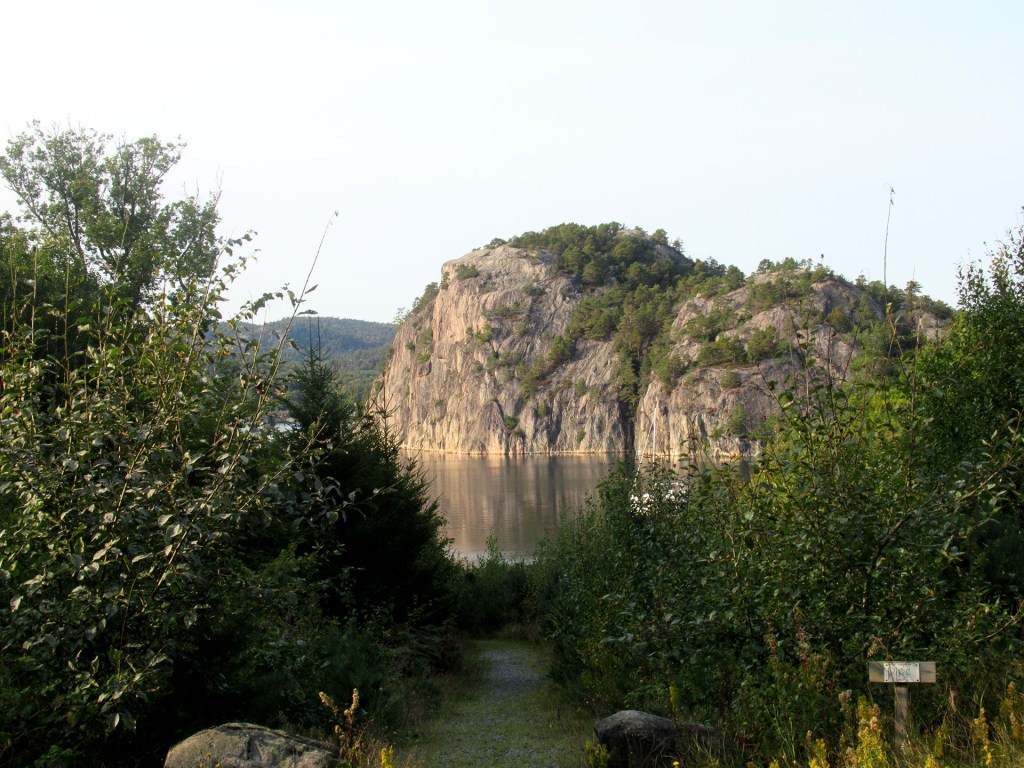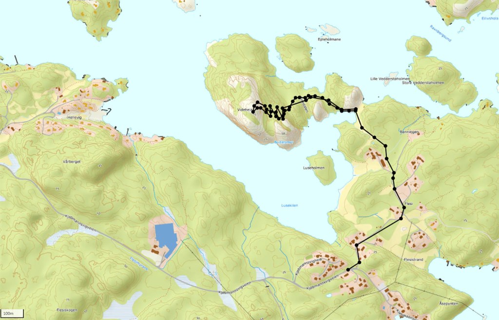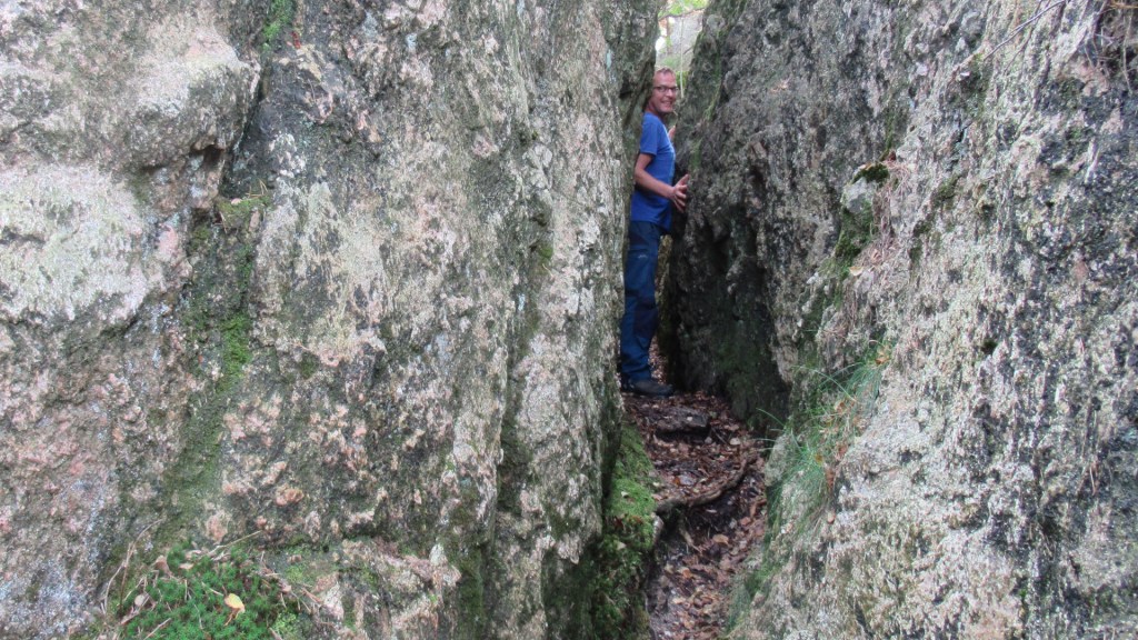 “Spiser du godt på toppen av fjellet kommer du ikke hjem igjen” , var det noen som sa. Det stemte. Dette er ikke en tur for de som har flere bilringer enn meg. Det er en tur for tynne. Jeg kom akkurat igjennom stiens smaleste punkt. Noen sier jeg er tjukk i hue, men heldigvis er fjellsprekkene litt bredere i hodehøyde. Dette er en tur utenom det vanlige og utenom allfarvei for oss turtuslere. Videhei, ved Kjøbmannsvig i Høvåg. Og vi valgte den fineste dagen denne høsten. Søndag 20 september,. Vindstille og sommergrader i luften. Turen er umerka, men stien er tydelig når du finner den. Det er verre med parkering. I Kjøbmannsvig finnes det lite parkering om du ikke har hytte på en av holmene der ute i Blindleia. Alle plassene er privat. Men vi fikk trøkka bilen inn i et søkk og traska av sted. Innover en privat-vei med fine små gårdstun og eplehaver. Etter en liten kilometer kommer en til en gård som er bygget i umalt materiale. Flott som bare det. Gå bak låven og stien begynner. Over noen jorder og ned til ei bukt. Da ser du starten på den egentlige løypa. Langs fjellet er det lagt steiner du kan gå på. Hele turen er bare 1,6 km lang, men det lille stykket er svært variert. Det er svaberg og vann, det er mørk skog og åpen skog. Det er bratte fjell, og ikke minst fjellsprekkene. Det er de som gjør turen så annerledes. Og det er her du må vurdere antall bilringer før du går gjennom. For det er veldig smalt. Og det er trangt i tillegg. Noen steder er det veldig bratt, så hold på de små. Jeg har prøvd turen i regnvær og det anbefales ikke. Oppe på toppen har en utsikt over blindleia og halvveis til Danmark. Litt varm saft og kjeks var lokkemiddelet til mine to turvenner Lucas og Bella.