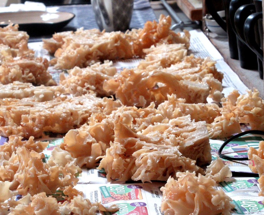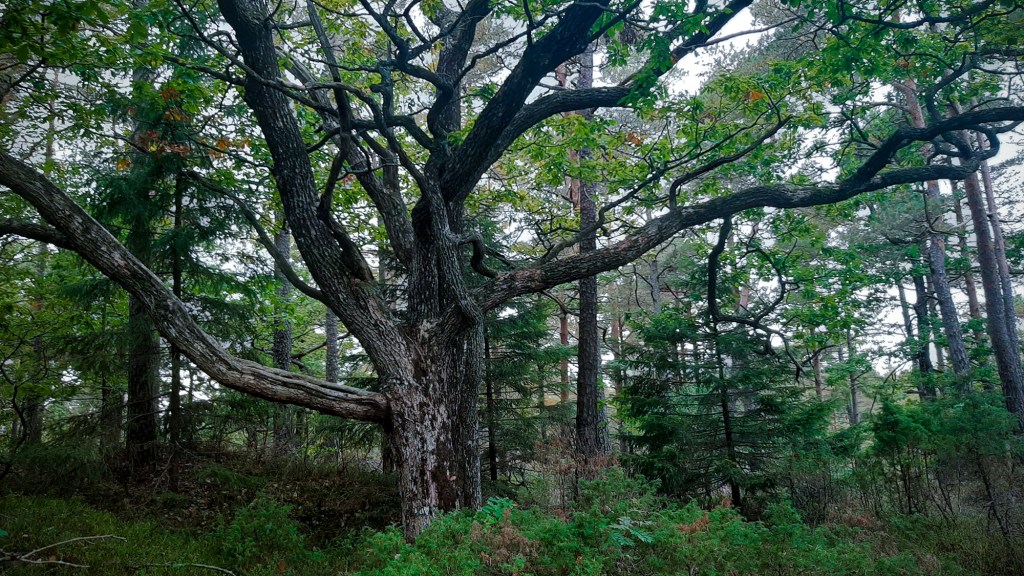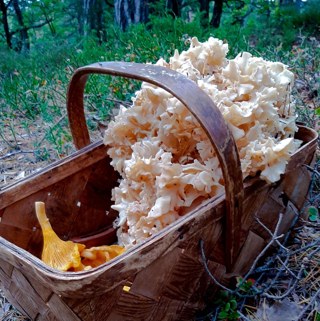 For av og til å dyrke min introverte sjel går jeg ut av stien og inn i skogen. Ganske ofte faktisk. Tyngre å gå, nye ting å se, stille. I sopptider som nå plukker jeg litt av skogens gull ,kantarellen, der den dukker opp. Men her en dag på min umålrettede kryss og tvers-tusling fant jeg skogens platina bak skogens konge. Et mektig gammelt eiketre sto og strakk sine armer mot himmelen. Og i dets skygge fant jeg en Blomkålsopp. En sjeldenhet og en kulinarisk opplevelse. Den kan bli over 10 kg tung men den jeg fant var kun et par kilo. Når den er tørket er det kanskje bare 150 gram igjen. Men smaken skal våre 3-stjerners. Og av helse-egenskaper kan en lese mer her; https://urbol.com/sparassis-crispa/