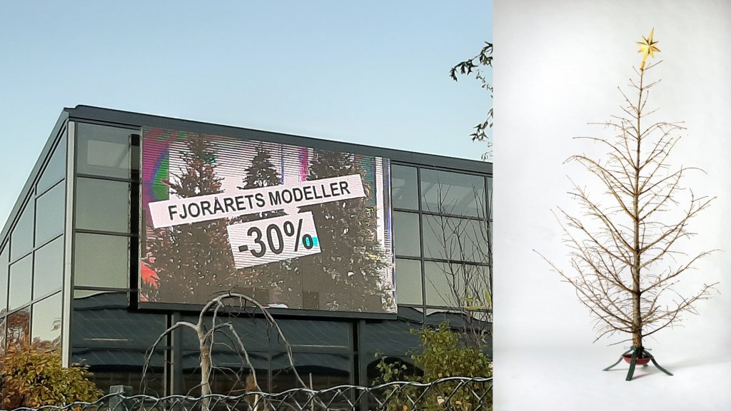 En gang var det kalkuner der. Der hvor lokketilbudet lyser. Skjønt lokketilbud? Fjorårets juletre, 30% avslag. Med 100 % færre barnåler enn julen 2019. Vel, hver sin smak. Jeg ser fordelen med å ikke støvsuge under treet, ei heller passe på at det er vann i skåla. Men; Jeg er såpass bluferdig, som en sørlending skal være, at jeg liker mitt juletre påkledd. I sin peneste grønneste julebunad. Med pynt som ikke allerede henger på treet i det du slår det opp som en paraply.