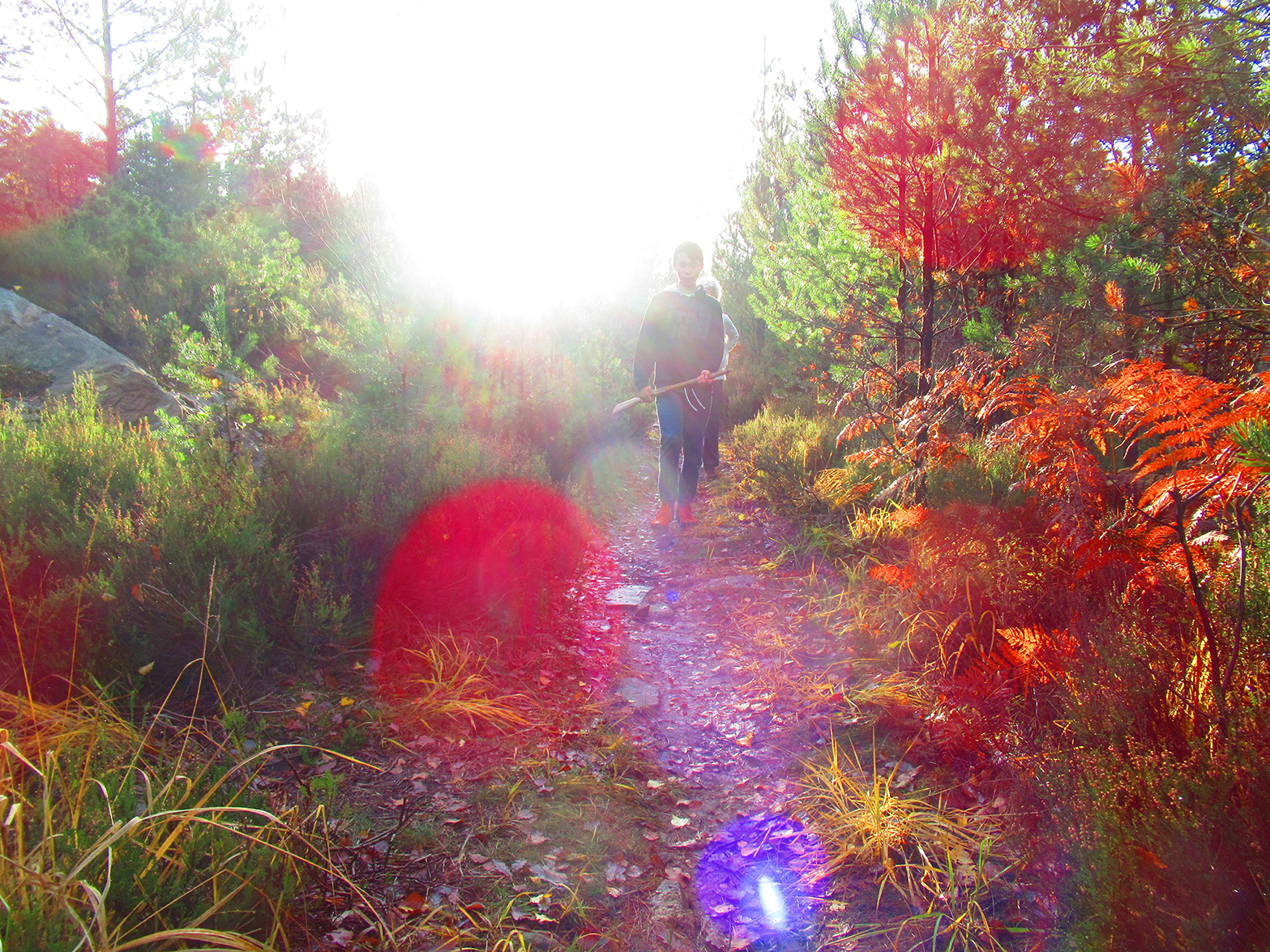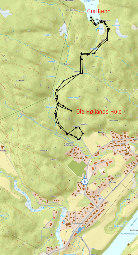 Ta turen nå, den er vel verdt det. Fine farger og masse vann i bekker og stryk. Bare tre og en halv kilometer att og fram. Akkurat langt nok til at det ikke er for langt. Det går mye oppover fra parkeringsplassen ved idrettsbanene på Solsletta i Tveit. Men løypa er bred og fin og av og til våt. Når det regner mye er stien blitt til bekk og balansenervene testes ut i det vi hopper fra gress-tuste til gress-tuste i håp om å holde oss tørre. En kort liten avstikker fra hoved-stien og du er på historisk grunn. Mestertyven og “folkehelten” Ole Høiland hadde en av sine hemmelige huler her i skogen. For ca 200 år siden stjal han masse. Ble arrestert en haug med ganger og rømte like mange ganger. Det skal visstnok være noen inskripsjoner akkurat her som han har laget. Turen videre oppover går i fin skog som blir finere og åpnere i det du ankommer Guritjønn. Guritjønn er et lite smykke av en plass. Som skapt for pølsebål og pause. I dag var dette akkurat langt nok. Men om du lyster kan du gå videre opp til Heietjønn, om mulig et ennå finere lite sted. Og tar du en annen vei hjem, kan du se rester av et tysk fly som styrtet i skogene her.
