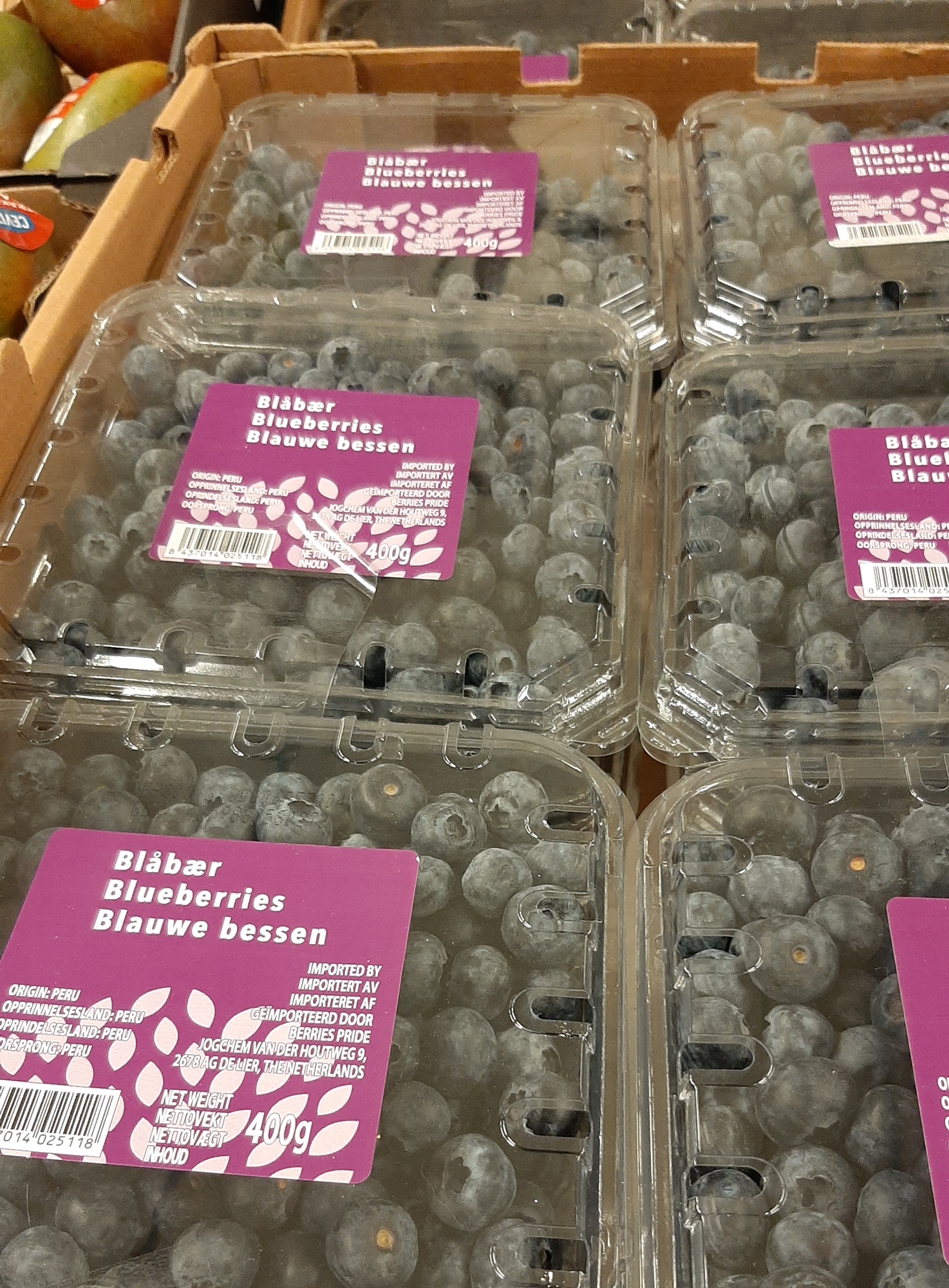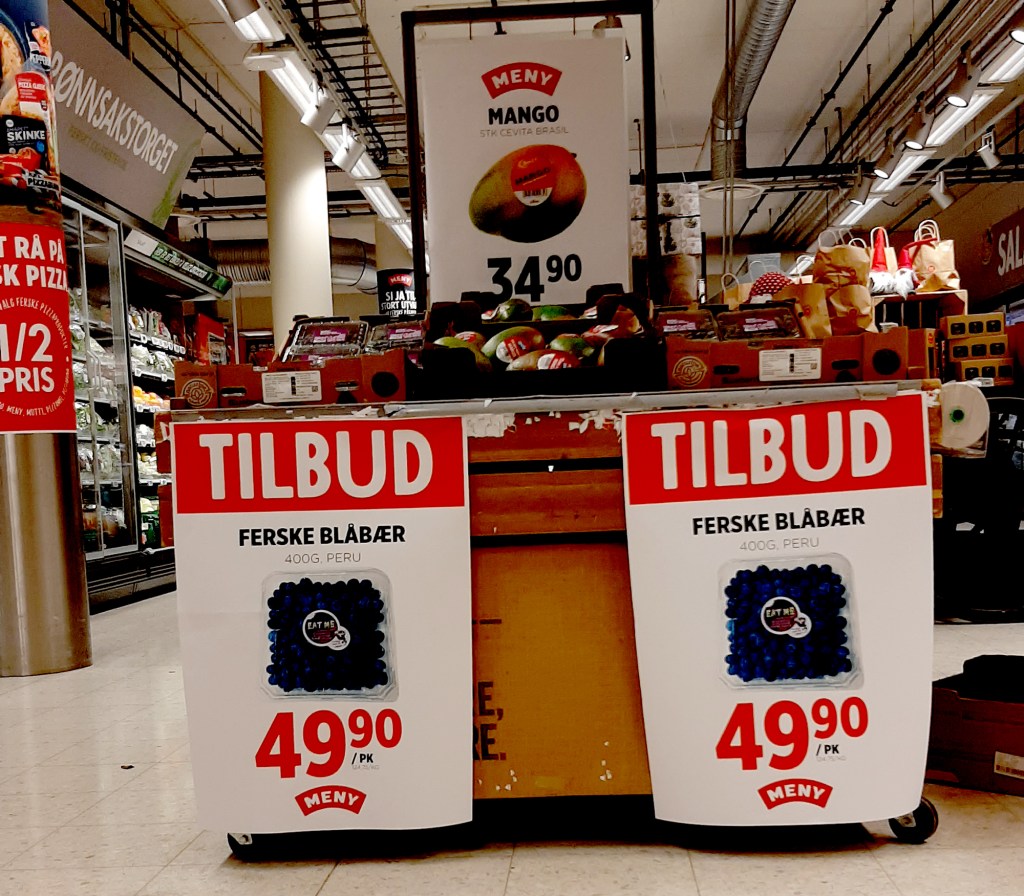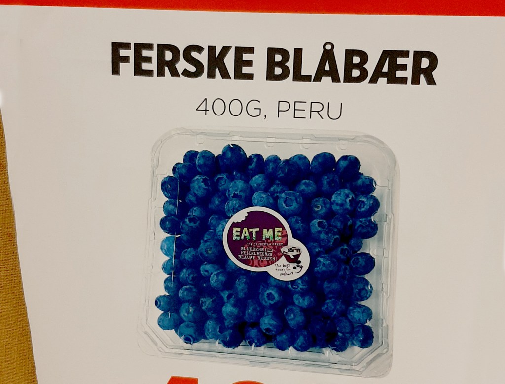 Jeg ville heller satset på RekoRingen enn Meny når det kommer til blåbær. Tror kortreist er bedre enn langreist. Det kan umulig være bare Blåbær i disse bærene på Meny. For av erfaring fra når jeg plukker blåbær om sensommeren blir jeg blå på henda og buksa og ræva og bærene safter seg med en gang. Og ligger de bitte litt ute på benken kommer andre sopper enn meg til å krype inn i bærene. Så derfor undres mitt enkle sin noe over disse ferske Blåbærene de selger på Meny. De er omtrent så langreiste som det er mulig å komme. De er plukket i Peru! PERU? Kanskje blåbærene der nede er parra med litt pulver fra valmuer for lengre holdbarhet. Hmm. Jeg tror jeg lar disse bærene være. Diese Blauwe Bessen.