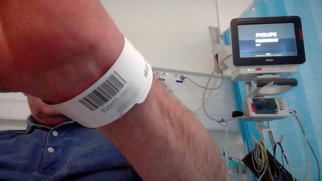Så lå jeg her igjen da. Mann på Akutten på Sørlandets Sykehus. Det er fem år siden sist. Og før det var det fem år siden . Det går i femårsintervaller ser det ut som. Første gang var det jetlag. Andre gang var jeg lemster. Denne gangen vet de ikke hva det er. Men her ligger jeg, en halv liter blod fattigere. EKG ganger 3 og gjennomlyst i røntgenrommet. Her ligger en mann med strekkode om håndleddet. Her ligger jeg, selv om jeg er mann. Og menn blir ikke syke. Menn går ikke til legen. Men jeg tok oppfordringen. Jeg gjør som min venn Ole sier; Gå til legen! Selv om du er mann. Det er jo ingen som ikke går til verksted med bilen når motoren fusker. Hvorfor skal vi da la være å gå til legen når kroppen fusker.