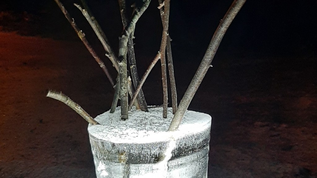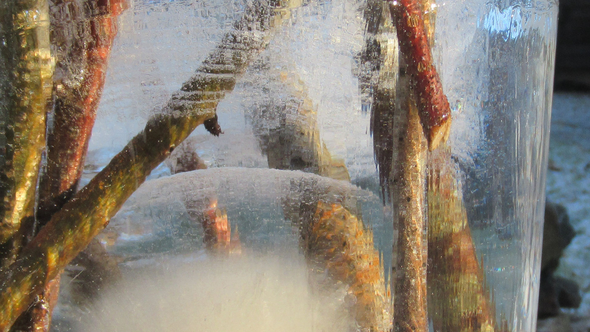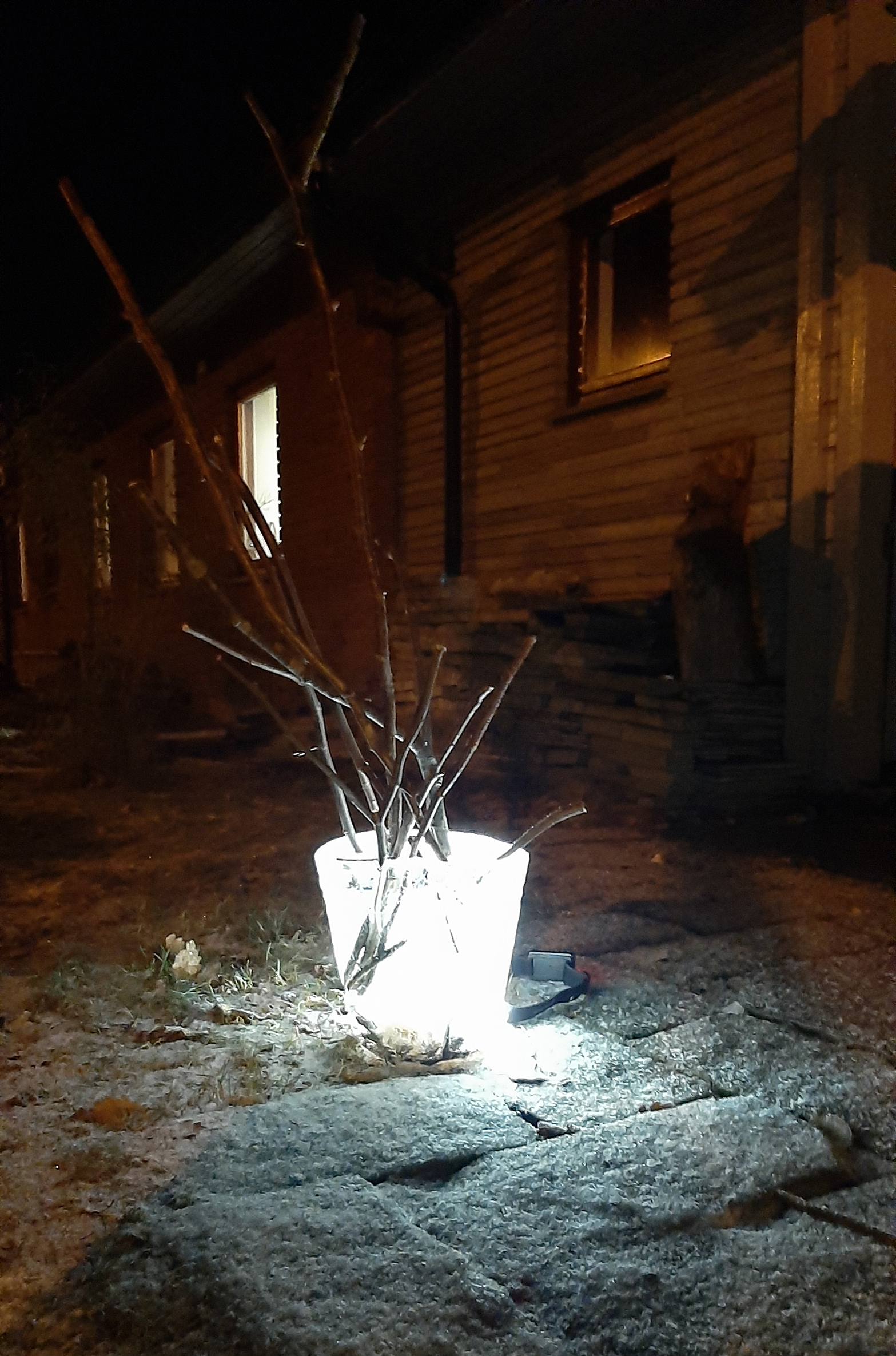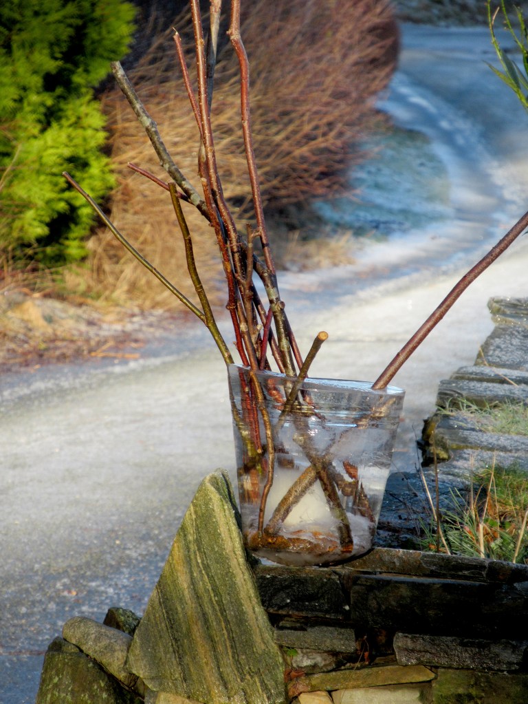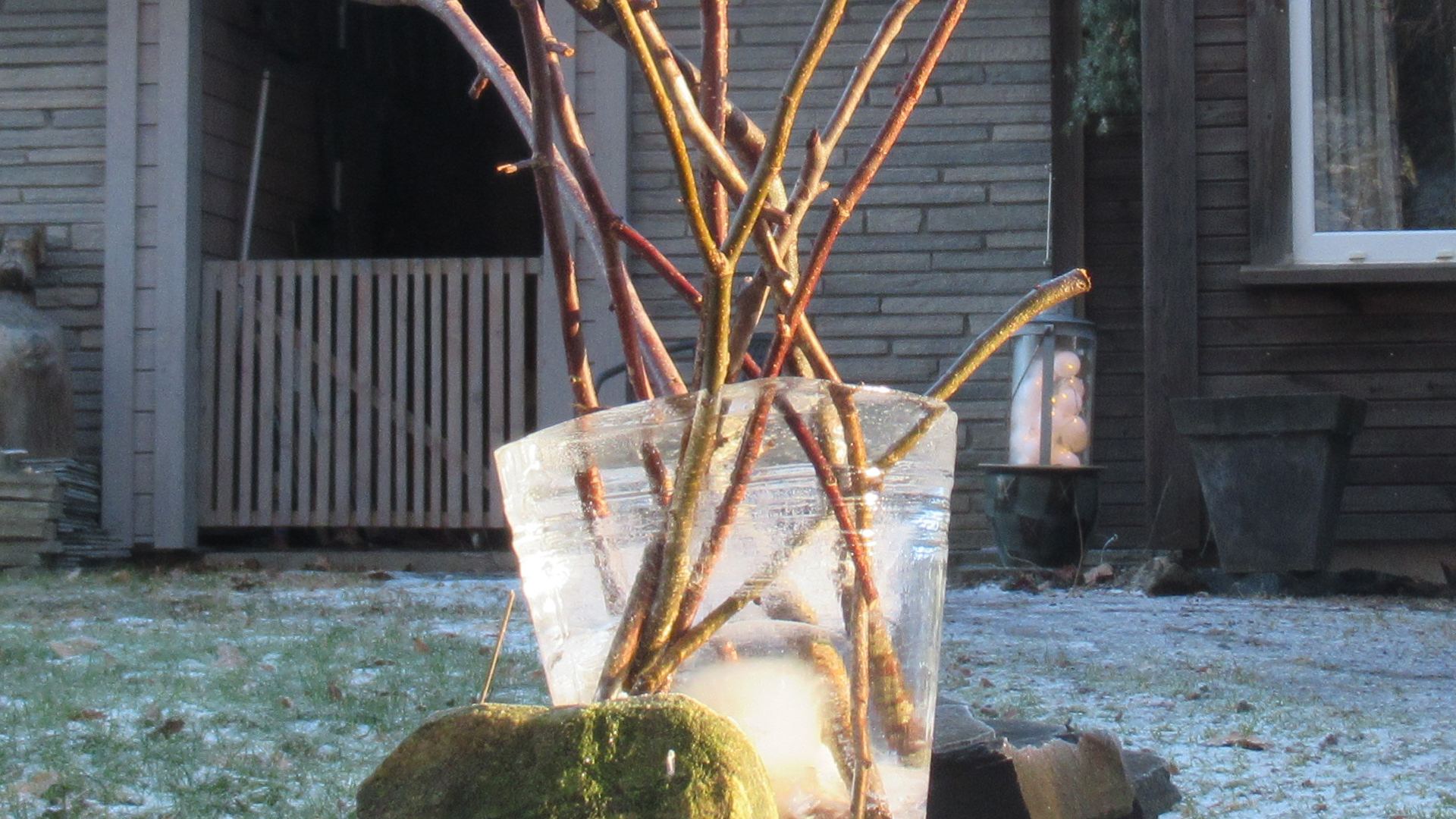 Tilfeldig vakker? Nei, jeg snakker ikke om meg selv. Jeg snakker om iskunstens ufortreffelighet. Jeg satt fra meg et knytte kvister i ei sinkbøtte på utsiden av huset. Det var i starten av desember. Så kom regnet som regnet og regnet helt til jul og nyttår og til bøtta var full. Så kom januar med kulda og bunnfryste bøtta. Så kom øynene som ser. Jeg måtte bare se. Jeg tinte vekk bøtta og satte lys under isklumpen med grener oppi. Et aldri så lite vakkert kunstverk pryder nå vårt inngangsparti.