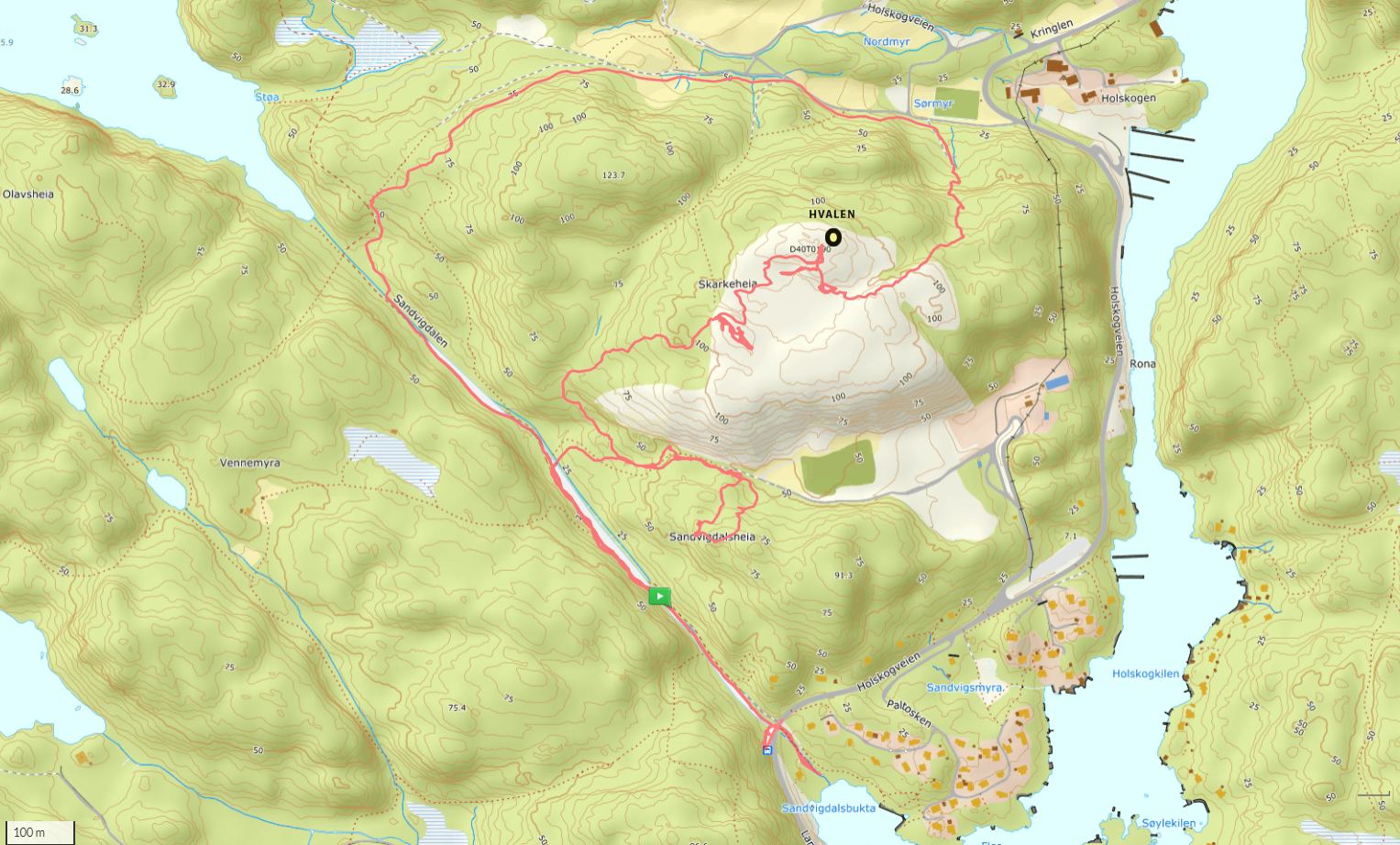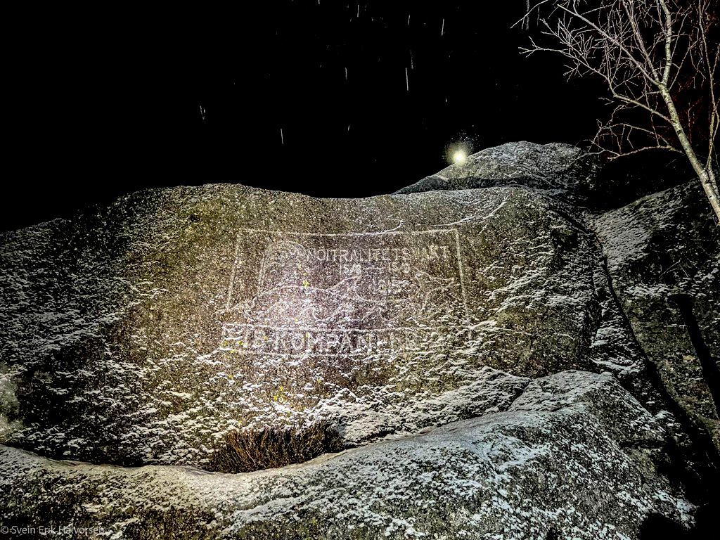 På en fjellside ytterst, litt forbi Holskogen er det hugget inn en hval. ???? Underlig, men fascinerende. Igjen ble jeg med inn i mørket med nye og gamle venner. Det ble en skikkelig bærtur uten å finne bær. Men hva gjør vel det. Stier er for pyser. Vi startet ved Sandvigdalsbukta langs Langenesveien. Stien var godt merka og skilt i stikryss, men sånt biter ikke på oss. Vi tok den smale sti innover i et frossent landskap. Inn i skogen opp på knausene på jakt etter Skarkehei. Men bærtur er fint. Mye latter og skravling og kaving.