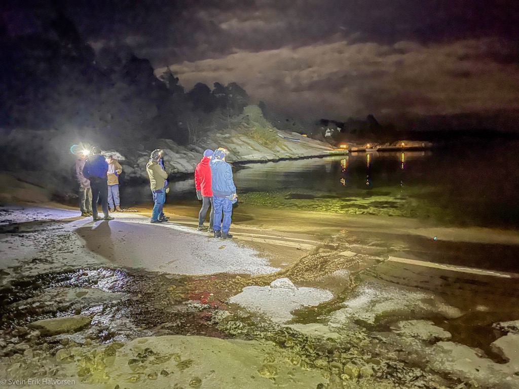 Vi fant Skarkehei etter hvert og Svein leste oss historien til helle-rissiningene fra 1915. En særegen sak langt inne i skogens mørke. Deretter geleidet han oss nok en gang utenom den mye oppgåtte sti. Nedover og nedover helt til vi gjenoppdaget noen nye blå merker. Turen ble avsluttet helt nede ved havet, i Sandvigdalsbukta. Blikk stille og kaldt og fint. Men ingen hval på havet, kun i skauen. Skogshval.