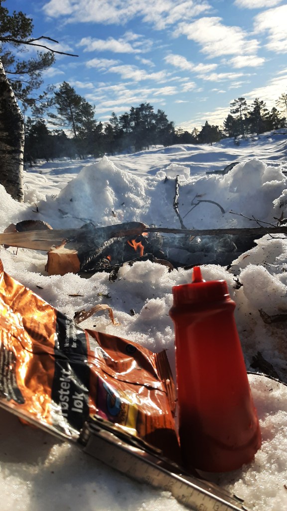 Her har jeg ikke vært før. Hit skal jeg igjen! Dette var fint. En labbeturkamerat sa jeg måtte prøve løypa som starter fra Høvårsland i Hægeland og går opp til Lauvås. Den var så rolig ,sa han. Rolig? Skjønte ikke helt først. Men det seg inn etter hvert som vi gikk. Du kan starte i begge ender, men fra Høvårsland går det litt oppover i starten. Og av erfaring så liker jeg helst at det går litt nedover på slutten så vi gikk oppover i starten. Men ikke så langt egentlig før vi var oppe i åpen lav furuskog. Glissent og fint. Løypa opp er 8 km, vi gikk 5 av dem før vi satt oss ned. Det var 9 kuldegrader og snøen tørr og fin. Sol fra skyfri himmel varmet kropp og sjel og et bål stekte våre vegetarpøler til det perfekte så ble vi varme i magen også.