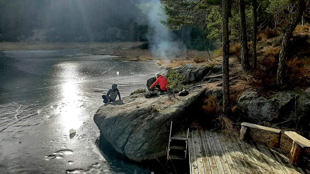 Rent bortsett fra at dette var en anelse spektakulært var turen dit og turen tilbake ganske fin. Opp og ned og att og fram. På fine stier og langs fine Vann. Vågsbygdskogen er godt merket og turmulighetene mange. Men alene er du altså ikke. Da må du gå lengre ut på landet. Og det gjorde vi. En bitteliten avstikker og vi fant en oase i iskanten. Bjorstøtjønn var akkurat tilpasset solen i dag. Flott. Et bål ble til og vår molefunkne tenåringsturkamerat våknet til live.
