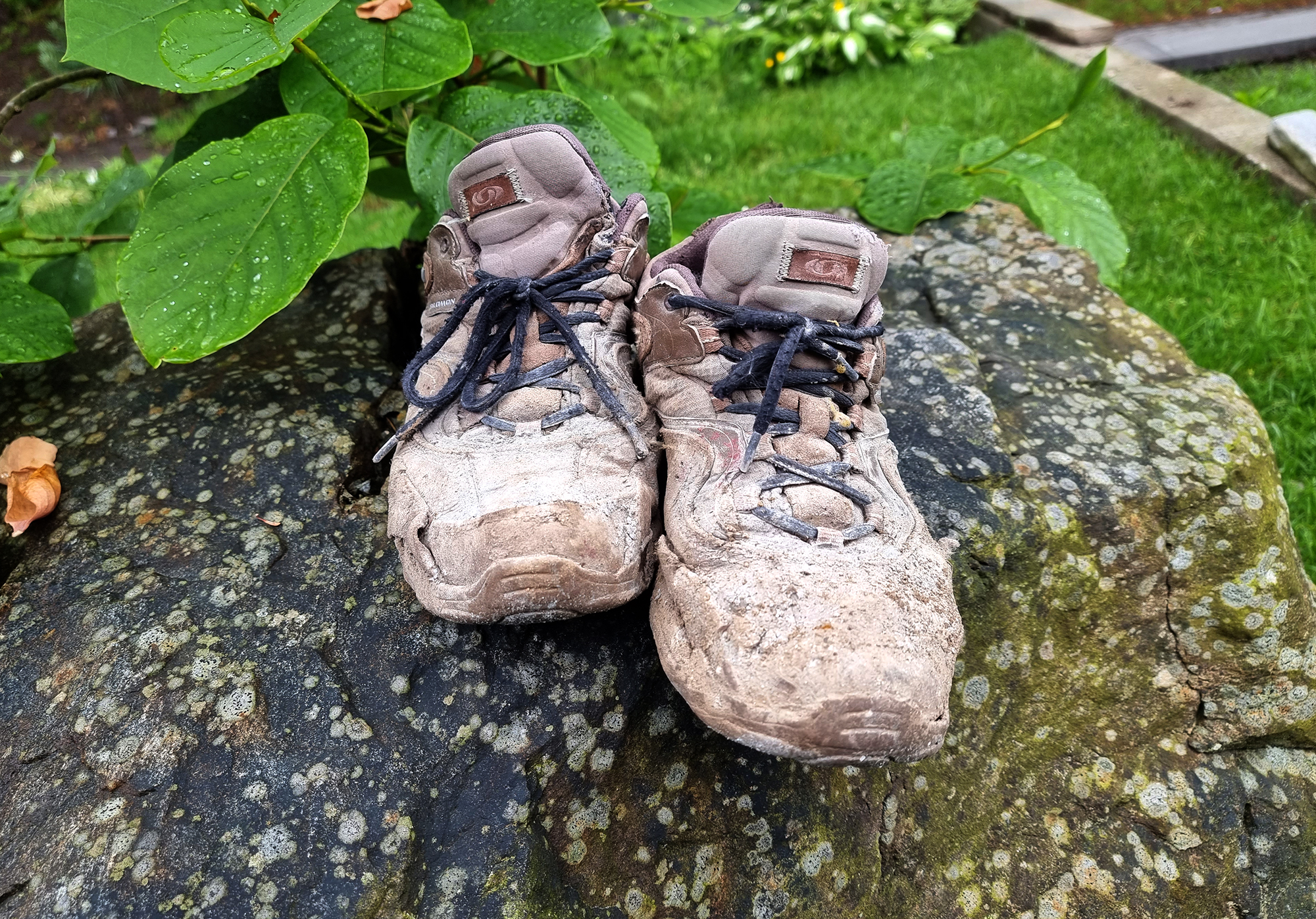 Enkelte ting blir en knyttet til. Det gjelder dette paret med sko. Vi har slått følge noen kilometer. Jeg husker ikke hvor og når jeg fikk dem, men de har fulgt meg lenge. De har vært med på utallige turer i mange land. De har gått på Hardangervidda og opp til Skråstadvarden. De har gått i jungelen i Mexico og langs strendene i Danmark. De har ventet på svaberget i Korsvikfjorden mens jeg har badet i sommervarmt havvann. De har stått på Kjeragbolten og blitt med til Prekestolen. De har alltid vært gode på beina og selv om lissene har blitt slitt har skoene holdt ut. Jeg har hatt mange par tursko og prøver å kjøpe kvalitet. Disse skoene var ikke de dyreste. Allikevel er det de som har holdt lengst. Et lykketreff av et par sko. De siste årene har dette paret vært hage-sko. De har bistått meg ved legging av plen og støping av mur. Nå sist holdt de beina mine tørre mens jeg vasset i sement.