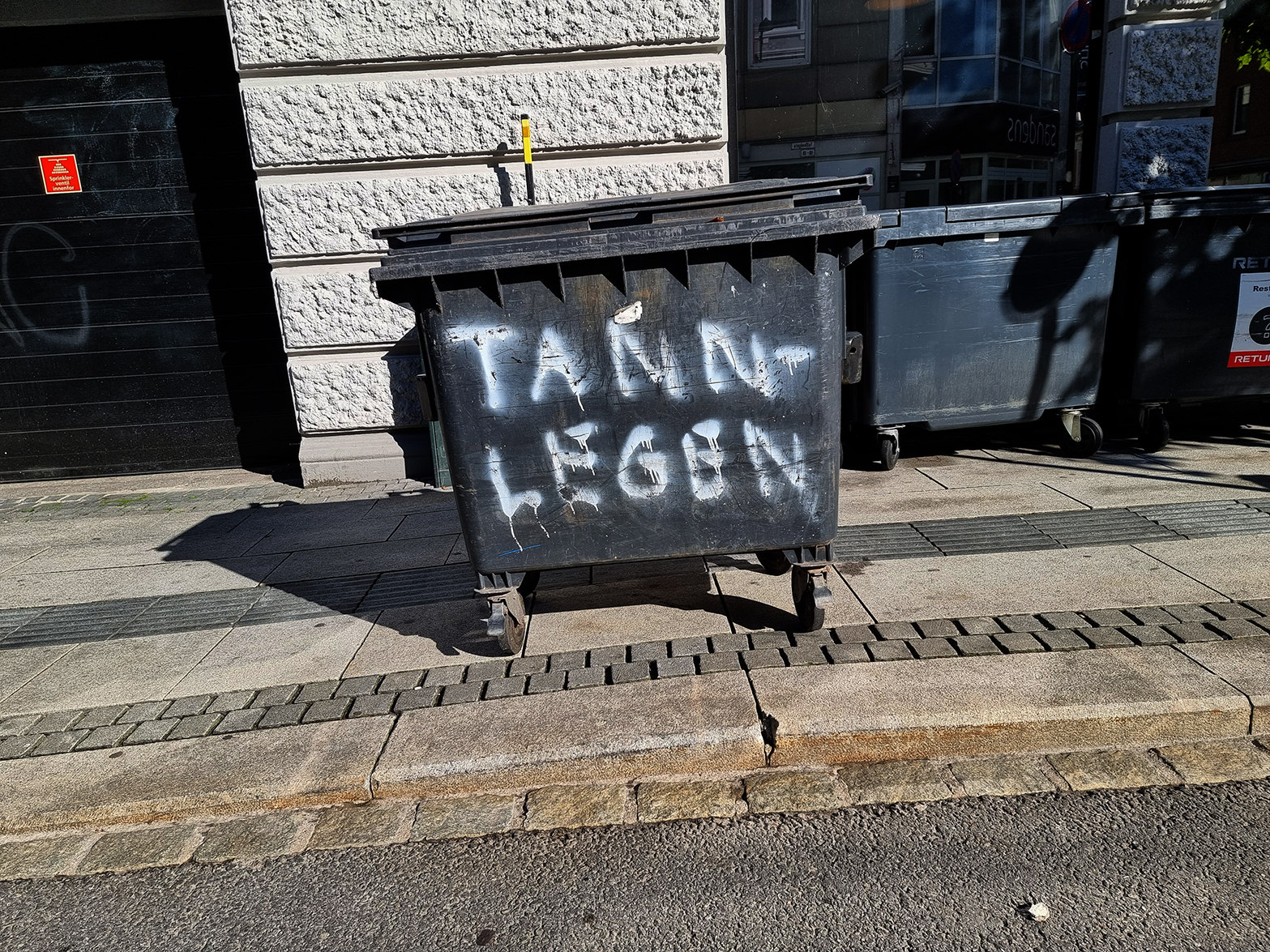 Tannlege . . . . . . . Jeg vet ikke helt hva jeg hadde forventet meg av en søppelcontainer tilhørende en tannlege. Men ikke dette. Jeg tenker på tannleger som kliniske, pertentlige, “by the book”, over gjennomsnittet opptatt av hygiene og renselse. Men ut fra en bakgård i Tollbodgata ble denne containeren dradd frem. Jeg turte ikke en gang gå på samme side som den. Det så ut som noe ennå levde oppi den. Jeg skifte fortau tvert. For tannlegen som eier denne containeren er ikke som andre tannleger. I alle fall ikke i hodet mitt. For her er det en som trekker tenner for gøy. Uten bedøvelse og svært langsomt. Eller kanskje svært brått. Kanskje tenner blir fjernet med balltre. Og boret er ikke nede i tanna før det kommer ut på andre siden. Tannlegestolen har nok noe av de samme egenskapene som en strekkbenk fra middelalderen og rommet den står i er sannsynligvis lydisolert. Hva tannlegen heter vet jeg ikke men navn som Freddy Krueger, Jason Vorhees eller Charles Lee “Chucky” Ray kommer frem i min klarsynthet.