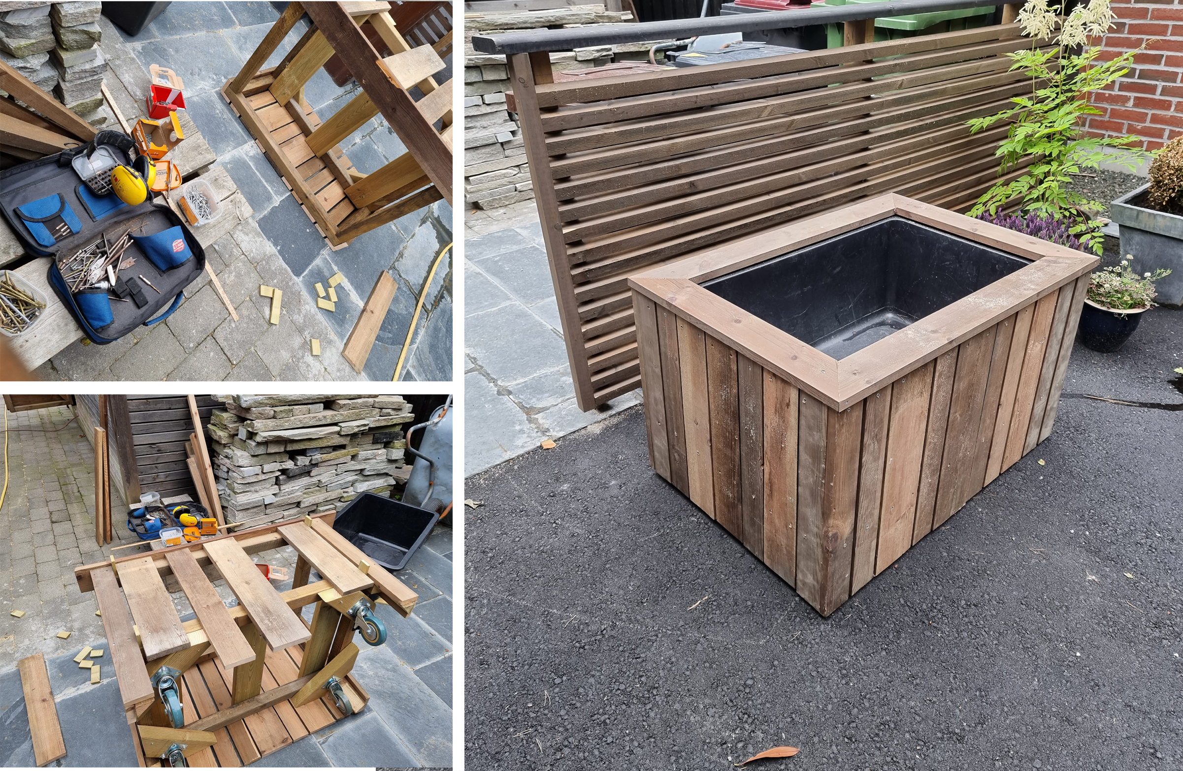 Hun vet hva hun gjør. Koner gjør ofte det. Oftere enn oss menn. “Det hadde vært fint med en blomsterkasse” sier hun, og reiser til Oslo ei uke. Damer er smarte slik. Og jeg er altfor enkel. “Hmm”, jeg tenker, ” jeg skal overraske henne med en blomsterkasse til hun kommer hjem fra Oslo,” tenker jeg og synes jeg har fått en god ide. Sannheten er nok at jeg på underlig smart vis har blitt manipulert og påvirket uten at jeg har oppfattet det av min reisende kone selv om hun sa det høyt til meg. Så med ledige kvelder satte jeg i gang. For det er jo gøy. Jeg kan planlegge og kjøre opp til godtebutikken Jula etter de nødvendige skruer og fester og kar og hjul. Det tar jo tross alt bare i gjennomsnitt 3 timer å handle på Jula for en mann som er alene hjemme. Og utenfor huset koser jeg meg med materialer behandlet med jernvitrol og sag drevet fram av lyd og strøm. Tomme tanker og tomme stokk. Jeg driller og sager og får vafler av naboen. Det jobbes så sagspona fyller takrenner og blomsterbed. Det blir fint og jeg ble ferdig. Og jaggu meg kom det ikke opp et gjerde også som jeg kan gjemme søppeldunkene bak.