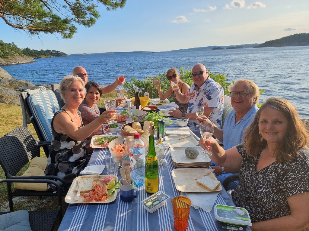 Vi dekket bordet med reker, loff og gode venner. Hva skal man si? Jeg har hatt det litt tankefullt den siste tiden. Rett og slett en del å tenke på som kan ha store konsekvenser for fremtiden. Jeg har latt meg bekymre og blitt litt mørk til sinns. Hva er vel da bedre å sitte ved kanten av et bord hvor gode venner omkranser resten. Min kone inviterte til reker og kos på plenen foran hytta. Plen er kanskje å ta godt i om dette humplete stykke land, men det gjorde nytta i går kveld. Stoler og bord og venner satt trygt og godt. Bare det å sitte der i stillhet og lytte til de andre var godt for sjelen. Vi spiste, drakk og lo. Vi smilte, diskuterte og utbragte skåler.