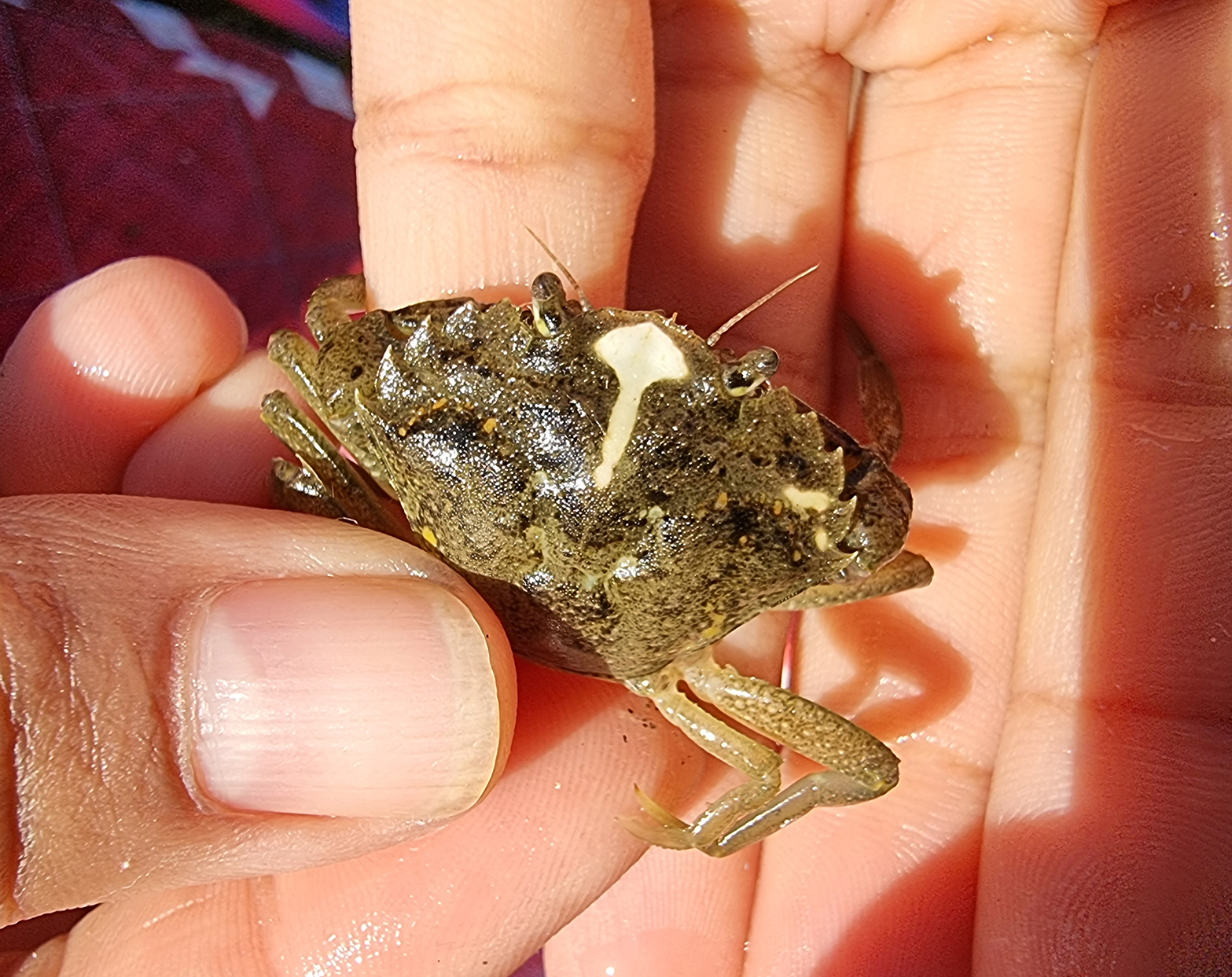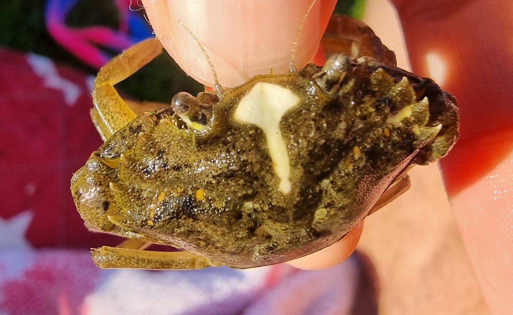 Denne krabba ble raskt døpt; Motekrabba. Den hadde tatt umaken med litt kroppsmaling. Skall, skall ikke tenkte den sikkert. Heldigvis for oss valgte den å pynte seg. Vi tror i alle fall det, barnebarnet og jeg. Men jeg mistenker den heller for at dette er malt på for å lure eventuelle predatorer. De som er ute etter små lekre krabber med lange ben. For mens pilen peker fremover og får jegeren til å planlegge hvor han skal sette inn angrepet løper krabben sidelengs inn under en beskyttende stein.