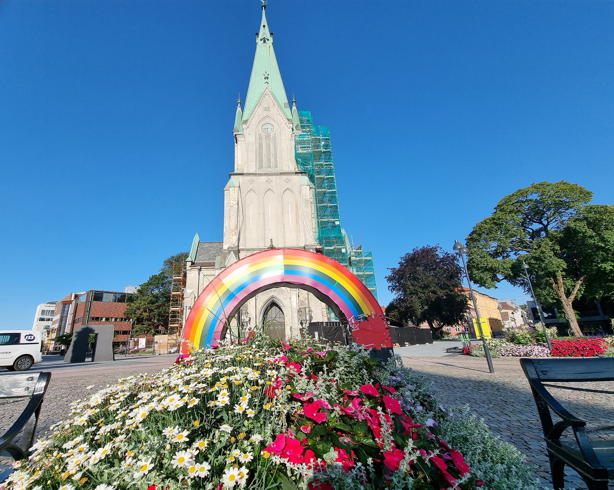De gremmes. De konservative kristne. De vrir seg allerede før de ligger i graven. De som vet bede og tror bedre enn andre. De er så rett-troende at jeg synes de tenker feil. For jeg liker det jeg ser. Det er godt å bo i et land og i en by og i et samfunn hvor toleransen vokser. Også i kirken. Regnbuen utenfor Domkirken i Kristiansand provoserer noen, men heldigvis færre enn før. De som vil lukke dørene og stenge både porter og muligheter for andre er i mindretall nå. Kirken utvikler seg den og. Det er godt å se den stå der. Regnbuen er et stolt symbol på mangfold og menneskeverd. Jeg liker det jeg ser. Redselen for fremmede minsker når de fremmede ikke er fremmede lenger.