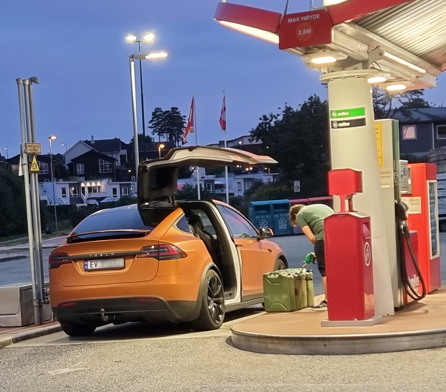Gamle vaner er vonde å vende og biler uten tanker er vonde å fylle. Men det finnes råd. I en overgangsfase kan en jo gjøre som denne personen. Ta med deg i din bil uten tank noen tanker. Fyll dem opp når prisen er lav. For enkelte er bensinprisjakten en altomsluttende hobby. Men som el-bileier er det ikke lenger aktuelt. Men han her har løsningen. Han unngår abstinensen som inntreffer ved kjøp av el-bil. El-bil eiere har ikke lenger unnskyldning for å henge på “tappen”, ta seg ei wiener og inngå en kaffeavtale. De må kjøre forbi med lange blikk.