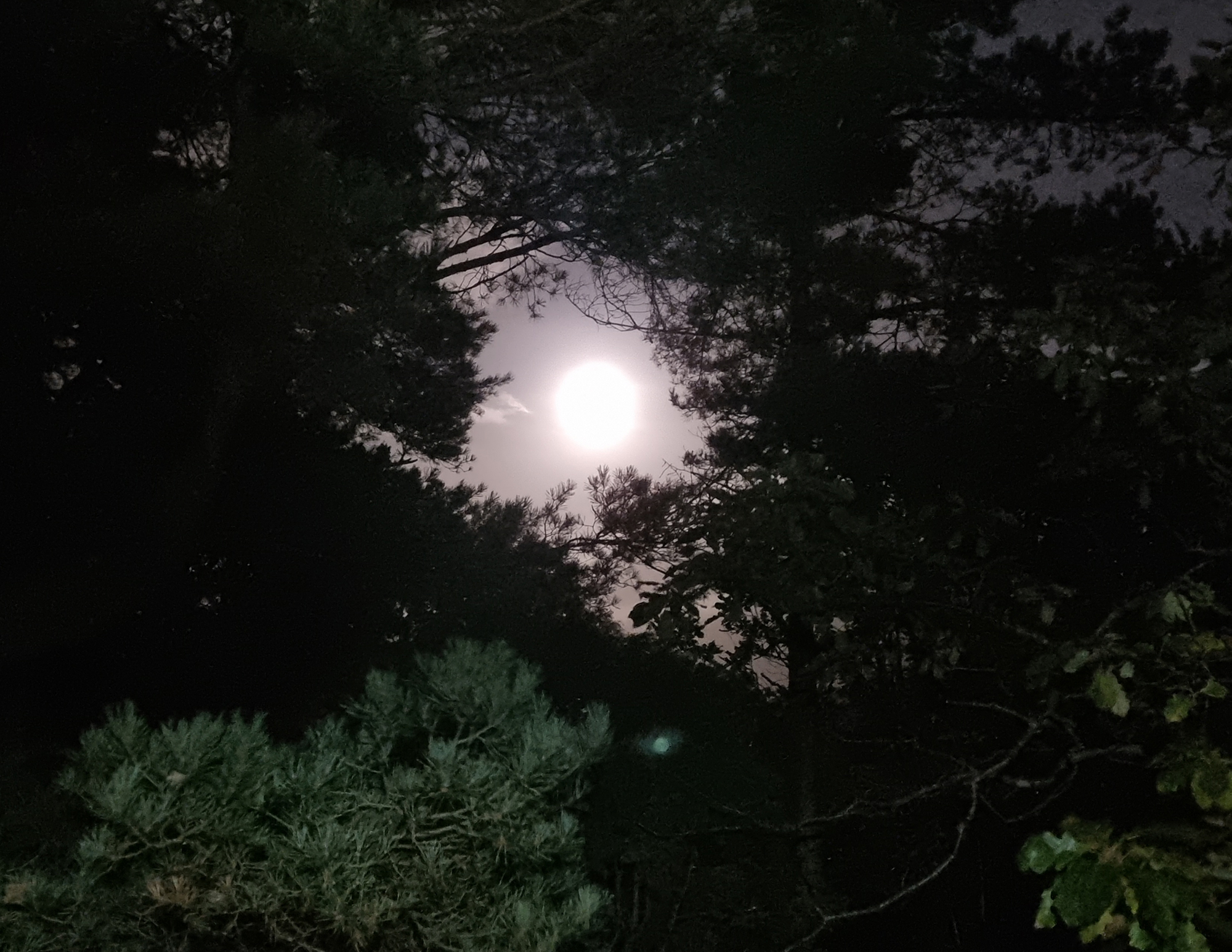 Når mørket omslutter meg og jeg er bare meg kan jeg tenke. Eller ikke. Noen ganger bare er jeg. I mørket er det nesten ikke noe som forstyrrer. Mørket er som ei god dyne om kvelden. Kanskje ikke like varm, men like trygg. Det omslutter meg. Det var ikke stille i går kveld. Det blåste så greiner knakk og trær vaiet. Allikevel var det stille. Stille i holdet. Jeg var alene, men ikke ensom. Jeg er aldri redd. En av grunnene er at jeg ikke forer meg selv med redsler fra TV og data. Jeg ser ikke skrekkfilmer. Jeg ser ikke SquidGames, denne folkekjære serien med skrekk og meningsløs vold. Det er ikke bra for meg å se slikt. Det er heller ikke bra for noen tror jeg. I går var det ca fullmåne og selv om jeg ikke så stort var det så flott. Fint og vakkert.