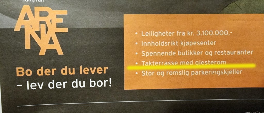 Det er nok en yrkesskade. Kommet til over tid. Men den kan jeg leve med. Jeg har jo ingen planer om verken å møte meg selv i veggen eller at noen liten frue kan velte mitt store lass. Ei heller skal jeg vanne bekken mens jeg går og så vet jeg jo at gresset er alltid på den andre siden. Vel, jeg er av sorten som får bilder i hodet. Og kanskje andre bilder enn hva som var tiltenkt av den som ytrer en tekst eller fotografi eller noget annet. Slik var det i dag da jeg så en annonse for et nybygg på Tangvall. Og ikke et ondt ord om Tangvall. Det er et fint sted, hovedstaden i Søgne og porten til Høllen. Tangvall er snart for en liten by å regne. Det som satte tankene i sving, eller muligens fikk dem til å stoppe var slagordet; Bo der du lever – lev der du bor . . . . .